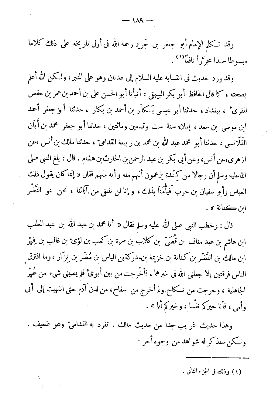 وَقَدْ تَكَلَّمَ الْإِمَامُ أَبُو جَعْفَرِ بْنُ جَرِيرٍ رَحِمَهُ اللَّهُ فِي أَوَّلِ تَارِيخِهِ عَلَى ذَلِكَ كَلَامًا مَبْسُوطًا جَيِّدًا مُحَرَّرًا نَافِعًا (1) .