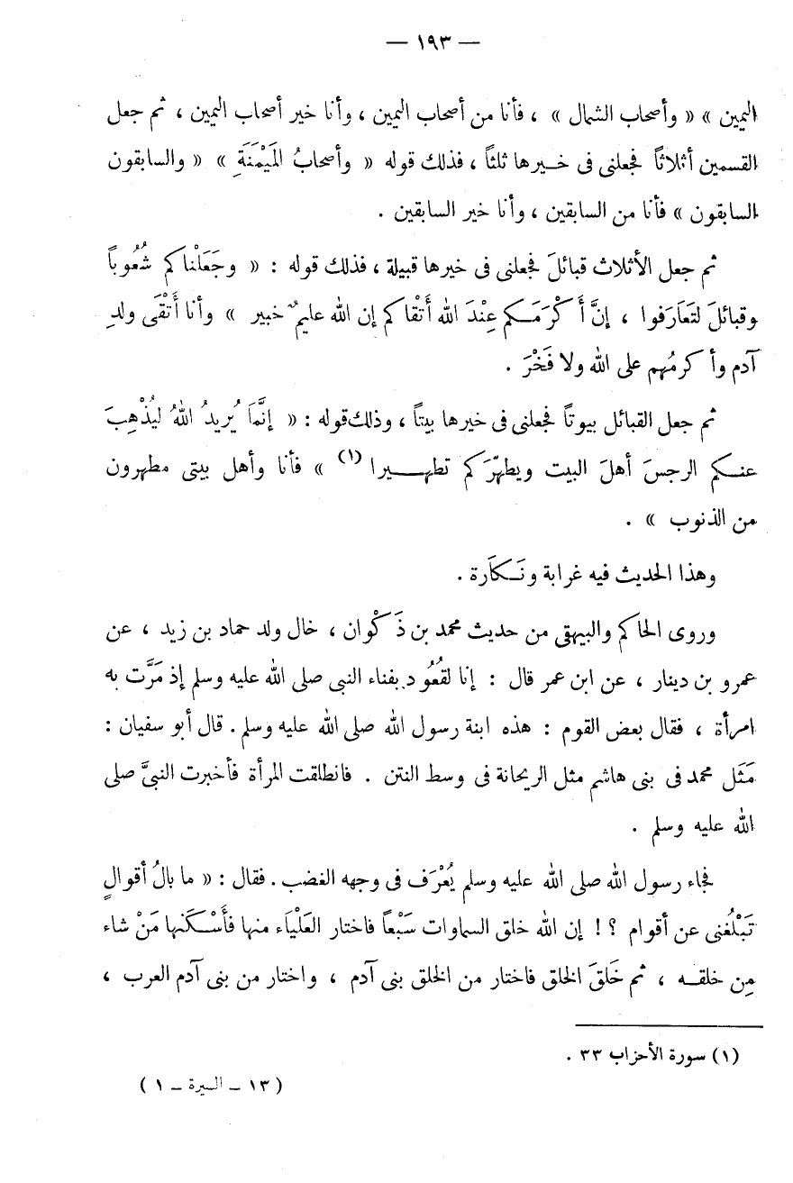 ثُمَّ جعل الا ثَلَاث قَبَائِلَ فَجَعَلَنِي فِي خَيْرِهَا قَبِيلَةً، فَذَلِكَ قَوْلُهُ: " وَجَعَلْنَاكُمْ شُعُوبًا وَقَبَائِلَ لِتَعَارَفُوا، إِنَّ أَكْرَمَكُمْ عِنْدَ الله أَتْقَاكُم إِن الله عليم خَبِير " وَأَنَا أَتْقَى وَلَدِ آدَمَ وَأَكْرَمُهُمْ عَلَى اللَّهِ وَلَا فَخْرَ.