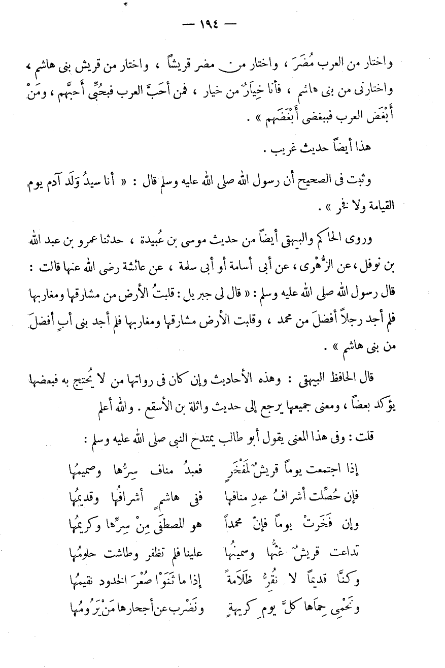 قُلْتُ: وَفِي هَذَا الْمَعْنَى يَقُولُ أَبُو طَالِبٍ يَمْتَدِحُ النَّبِيَّ صَلَّى اللَّهُ عَلَيْهِ وَسَلَّمَ: إِذَا اجْتَمَعَتْ يَوْمًا قُرَيْشٌ لِمَفْخَرٍ * فَعَبْدُ مَنَافٍ سِرُّهَا وَصَمِيمُهَا فَإِنْ حُصِّلَتْ أَشْرَافُ عَبْدِ مَنَافِهَا * فَفِي هَاشِمٍ أَشْرَافُهَا وَقَدِيمُهَا وَإِنْ فَخَرَتْ يَوْمًا فَإِنَّ مُحَمَّدًا * هُوَ الْمُصْطَفَى مِنْ سِرِّهَا وَكَرِيمُهَا تَدَاعَتْ قُرَيْشٌ غَثُّهَا وَسَمِينُهَا * عَلَيْنَا فَلَمْ تَظْفَرْ وَطَاشَتْ حُلُومُهَا وَكُنَّا قَدِيمًا لَا نُقِرُّ ظُلَامَةً * إِذَا مَا ثَنَوْا صُعْرَ الْخُدُودِ نُقِيمُهَا