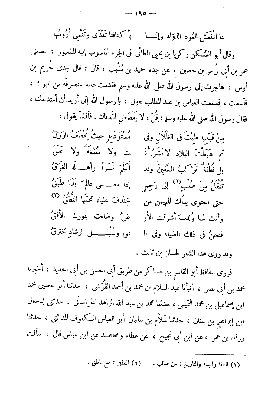 بِنَا انْتَعَشَ الْعُودُ الذَّوَاءُ وَإِنَّمَا * بِأَكْنَافِنَا تَنْدَى وتنمى أرومها وَقَالَ أَبُو السكن زَكَرِيَّا بْنُ يَحْيَى الطَّائِيُّ فِي الْجُزْءِ الْمَنْسُوبِ إِلَيْهِ الْمَشْهُور: حَدَّثَنى عمر بن أَبى زحر بن حُصَيْن، عَنْ جَدِّهِ حُمَيْدِ بْنِ مُنْهِبٍ، قَالَ: قَالَ جَدِّي خُرَيْمُ بْنُ أَوْسٍ: هَاجَرْتُ إِلَى رَسُولِ اللَّهِ صَلَّى اللَّهُ عَلَيْهِ وَسَلَّمَ فَقَدِمْتُ عَلَيْهِ مُنْصَرَفَهُ مِنْ تَبُوكَ، فَأَسْلَمْتُ، فَسَمِعْتُ الْعَبَّاسَ بْنَ عَبْدِ الْمُطَّلِبِ يَقُولُ: يَا رَسُولَ اللَّهِ إِنِّي أُرِيدُ أَنْ أَمْتَدِحَكَ، فَقَالَ رَسُولُ اللَّهِ صَلَّى اللَّهُ عَلَيْهِ وَسَلَّمَ: قُلْ، لَا يَفْضُضِ اللَّهُ فَاكَ.
