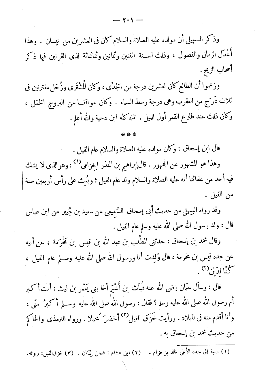 قَالَ إِبْرَاهِيمُ بْنُ الْمُنْذِرِ الْحِزَامِيُّ (1) : وَهُوَ الَّذِي لَا يَشُكُّ فِيهِ أَحَدٌ مِنْ عُلَمَائِنَا أَنَّهُ عَلَيْهِ الصَّلَاةُ وَالسَّلَامُ وُلِدَ عَامَ الْفِيلِ، وَبُعِثَ عَلَى رَأْسِ أَرْبَعِينَ سَنَةً مِنَ الْفِيلِ.