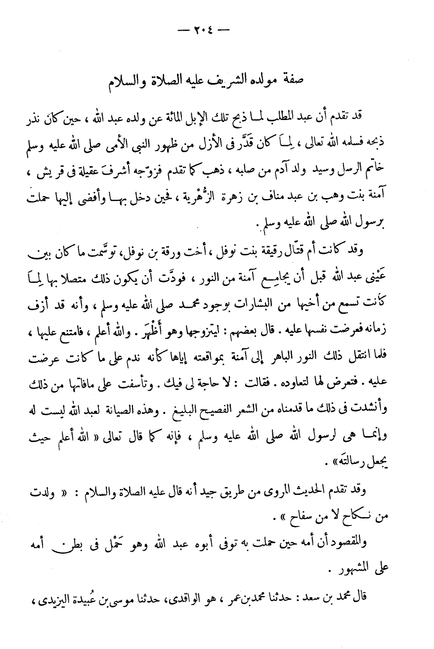 صِفَةُ مَوْلِدِهِ الشَّرِيفِ عَلَيْهِ الصَّلَاةُ وَالسَّلَامُ قَدْ تَقَدَّمُ أَنَّ عَبْدَ الْمُطَّلِبِ لَمَّا ذَبَحَ تِلْكَ الْإِبِلَ الْمِائَةَ عَنْ وَلَدِهِ عَبْدِ اللَّهِ، حِينَ كَانَ نَذَرَ ذَبْحَهُ فَسَلَّمَهُ اللَّهُ تَعَالَى، لِمَا كَانَ قُدِّرَ فِي الْأَزَلِ مِنْ ظُهُورِ النَّبِيِّ الْأُمِّيِّ صَلَّى اللَّهُ عَلَيْهِ وَسَلَّمَ خَاتَمِ الرُّسُلِ وَسيد ولد آدم من صلبه، ذهب كَمَا تَقَدَّمَ فَزَوَّجَهُ أَشْرَفَ عَقِيلَةٍ فِي قُرَيْشٍ، آمِنَة بنت وهب بن عبد منَاف بن زُهْرَةِ الزُّهْرِيَّةَ، فَحِينَ دَخَلَ بِهَا وَأَفْضَى إِلَيْهَا حَمَلَتْ بِرَسُولِ اللَّهِ صَلَّى اللَّهُ عَلَيْهِ وَسَلَّمَ.