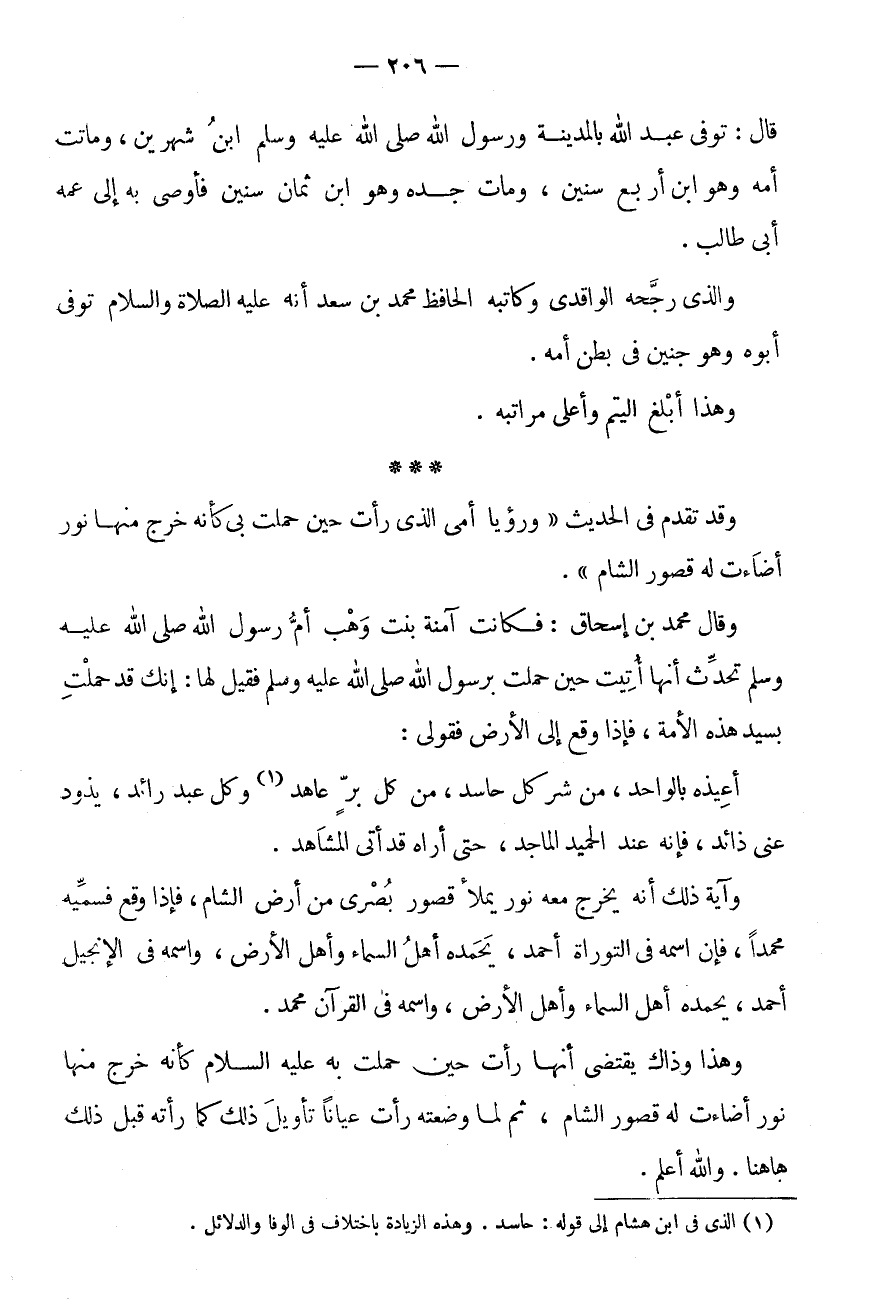 وَقَالَ مُحَمَّدُ بْنُ إِسْحَاقَ: فَكَانَتْ آمِنَةُ بِنْتُ وَهْبٍ أُمُّ رَسُولِ اللَّهِ صَلَّى اللَّهُ عَلَيْهِ وَسَلَّمَ تُحَدِّثُ أَنَّهَا أُتِيَتْ حِينَ حَمَلَتْ بِرَسُولِ اللَّهِ صَلَّى اللَّهُ عَلَيْهِ وَسَلَّمَ فَقِيلَ لَهَا: إِنَّكِ قَدْ حَمَلْتِ بِسَيِّدِ هَذِهِ الْأُمَّةِ، فَإِذَا وَقَعَ إِلَى الْأَرْضِ فَقُولِي: أُعِيذُهُ بِالْوَاحِدْ، مِنْ شَرِّ كُلِّ حَاسِدْ، من كل بر عَاهَدَ (1) وكل عبد رائد، يذود عَنى ذائد، فَإِنَّهُ عِنْد الْحَمِيدِ الْمَاجِدْ، حَتَّى أَرَاهُ قَدْ أَتَى الْمَشَاهِدْ.