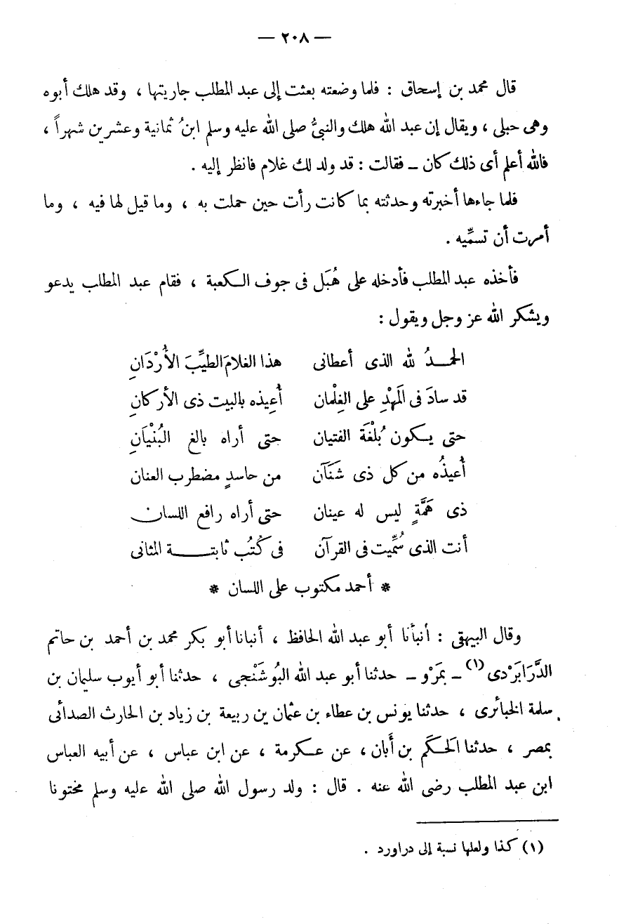 فَأَخَذَهُ عَبْدُ الْمُطَّلِبِ فَأَدْخَلَهُ عَلَى هُبَلَ فِي جَوْفِ الْكَعْبَةِ، فَقَامَ عَبْدُ الْمُطَّلِبِ يَدْعُو وَيَشْكُرُ الله عزوجل وَيَقُولُ: الْحَمْدُ لِلَّهِ الَّذِي أَعْطَانِي * هَذَا الْغُلَامَ الطَّيِّبَ الْأَرْدَانِ قَدْ سَادَ فِي الْمَهْدِ عَلَى الغلمان * أُعِيذهُ بِالْبَيْتِ ذِي الْأَرْكَانِ حَتَّى يَكُونَ بِلُغَةِ الْفِتْيَانِ * حَتَّى أَرَاهُ بَالِغَ الْبُنْيَانِ أُعِيذُهُ مِنْ كُلِّ ذِي شَنَآنِ * مِنْ حَاسِدٍ مُضْطَرِبِ الْعِنَانِ ذِي هِمَّةٍ لَيْسَ لَهُ عَيْنَانِ * حَتَّى أَرَاهُ رَافِعَ اللِّسَانِ أَنْت الذى سميت فِي الْقُرْآن * فِي كتب ثَابِتَة المثانى * أَحْمد مَكْتُوب عَلَى اللِّسَانِ * وَقَالَ الْبَيْهَقِيُّ: أَنْبَأَنَا أَبُو عَبْدِ اللَّهِ الْحَافِظُ، أَنْبَأَنَا أَبُو بَكْرٍ مُحَمَّدُ بْنُ أَحْمَدَ بْنِ حَاتِمٍ الدرابردى (1) - بِمَرْوٍ - حَدَّثَنَا أَبُو عَبْدِ اللَّهِ الْبُوشَنْجِيُّ، حَدَّثَنَا أَبُو أَيُّوبَ سُلَيْمَانُ بْنُ