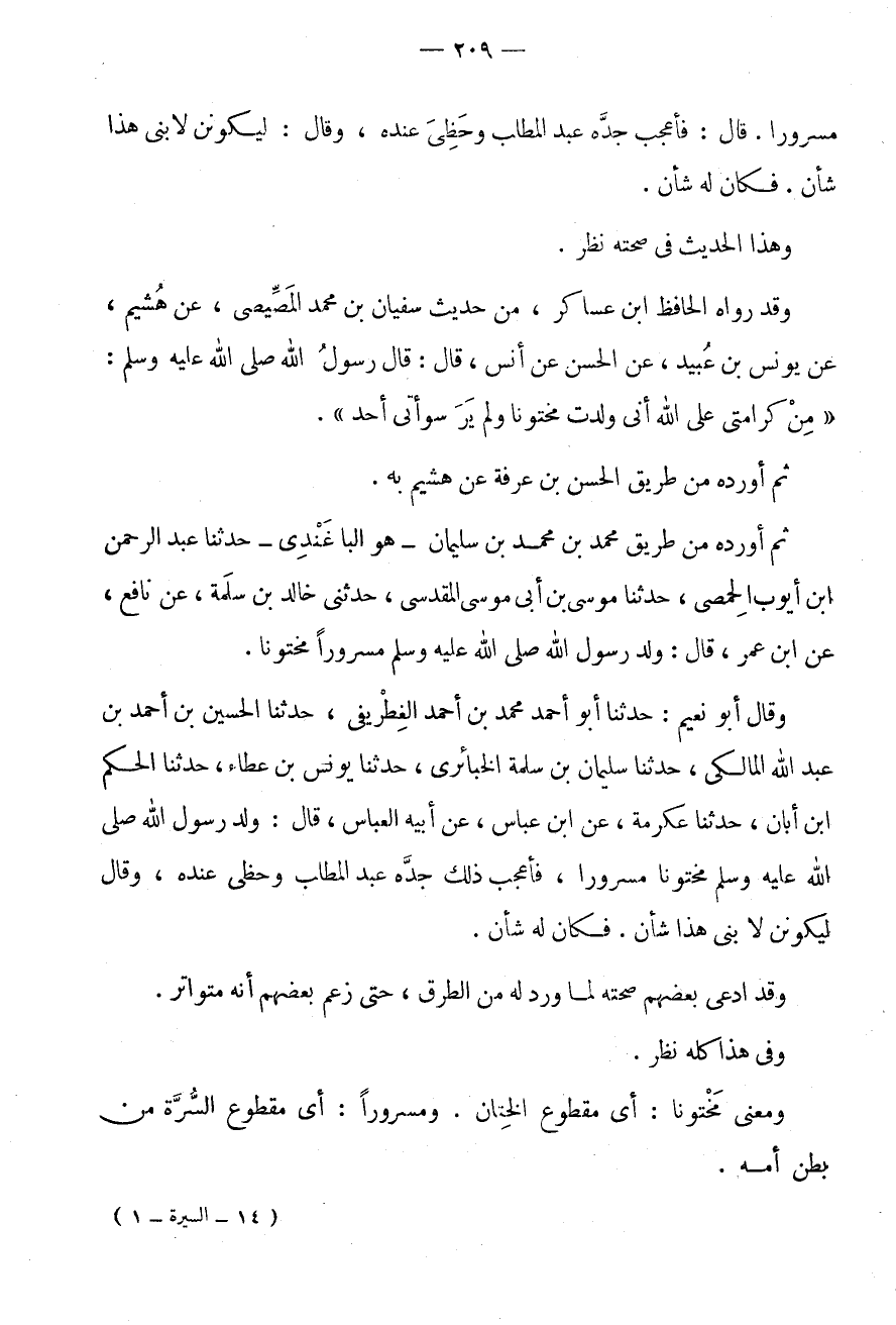 وَقَالَ أَبُو نُعَيْمٍ: حَدَّثَنَا أَبُو أَحْمَدَ مُحَمَّدُ بْنُ أَحْمَدَ الْغِطْرِيفِيُّ، حَدَّثَنَا الْحُسَيْنُ بْنُ أَحْمَدَ بْنِ عَبْدِ اللَّهِ الْمَالِكِيُّ، حَدَّثَنَا سُلَيْمَانُ بْنُ سَلَمَةَ الْخَبَائِرِيُّ، حَدَّثَنَا يُونُسُ بْنُ عَطَاءٍ، حَدَّثَنَا الْحَكَمُ ابْن أَبَانٍ، حَدَّثَنَا عِكْرِمَةُ، عَنِ ابْنِ عَبَّاسٍ، عَنْ أَبِيهِ الْعَبَّاسِ، قَالَ: وُلِدَ رَسُولُ اللَّهِ صَلَّى اللَّهُ عَلَيْهِ وَسَلَّمَ مَخْتُونًا مَسْرُورًا، فَأَعْجَبَ ذَلِكَ جَدَّهُ عَبْدَ الْمُطَّلِبِ وَحَظِيَ عِنْدَهُ، وَقَالَ لَيَكُونَنَّ لِابْنِي هَذَا شَأْنٌ.