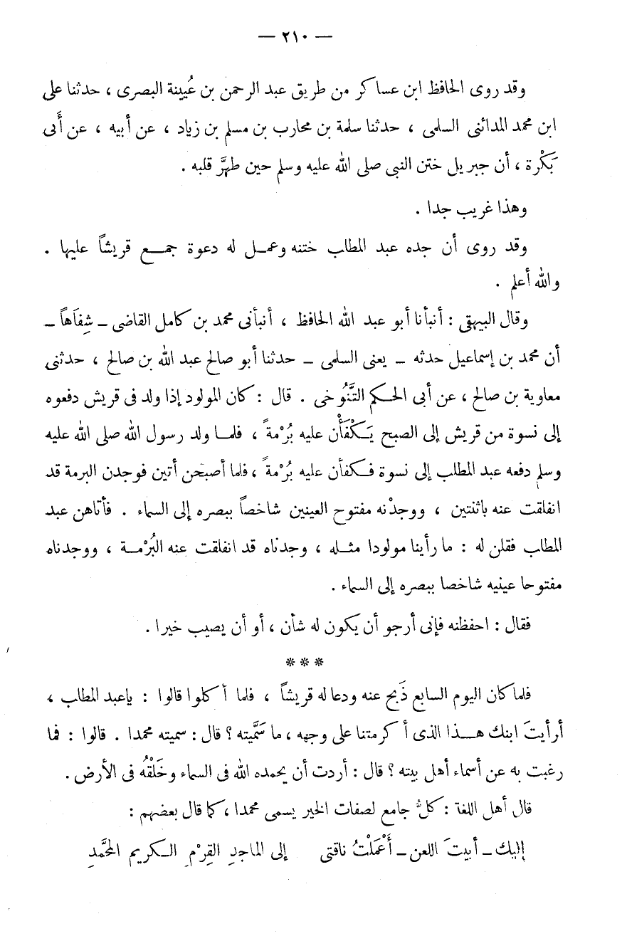 فَلَمَّا كَانَ الْيَوْمُ السَّابِعُ ذَبَحَ عَنْهُ وَدَعَا لَهُ قُرَيْشًا، فَلَمَّا أَكَلُوا قَالُوا: يَا عَبْدَ الْمُطَّلِبِ، أَرَأَيْتَ ابْنَكَ هَذَا الَّذِي أَكْرَمْتَنَا عَلَى وَجْهِهِ، مَا سَمَّيْتَهُ؟ قَالَ: سَمَّيْتُهُ مُحَمَّدًا.