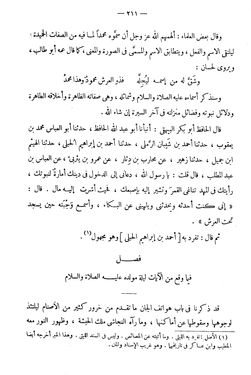 وَقَالَ بعض الْعلمَاء: ألهمهم الله عزوجل أَنْ سَمَّوْهُ مُحَمَّدًا لِمَا فِيهِ مِنَ الصِّفَاتِ الْحَمِيدَةِ، لِيَلْتَقِيَ الِاسْمُ وَالْفِعْلُ، وَيَتَطَابَقَ الِاسْمُ وَالْمُسَمَّى فِي الصُّورَةِ وَالْمَعْنَى، كَمَا قَالَ عَمُّهُ أَبُو طَالِبٍ، وَيُرْوَى لِحَسَّانَ: وَشَقَّ لَهُ مِنَ اسْمِهِ لِيُجِلَّهُ * فَذُو الْعَرْشِ مَحْمُودٌ وَهَذَا مُحَمَّدُ وَسَنَذْكُرُ أَسْمَاءَهُ عَلَيْهِ الصَّلَاةُ وَالسَّلَامُ وَشَمَائِلَهُ، وَهِيَ صِفَاتُهُ الظَّاهِرَةُ وَأَخْلَاقُهُ الطَّاهِرَةُ وَدَلَائِلُ نَبُّوَّتِهِ وَفَضَائِلُ مَنْزِلَتِهِ فِي آخِرِ السِّيرَةِ إِنْ شَاءَ اللَّهُ.