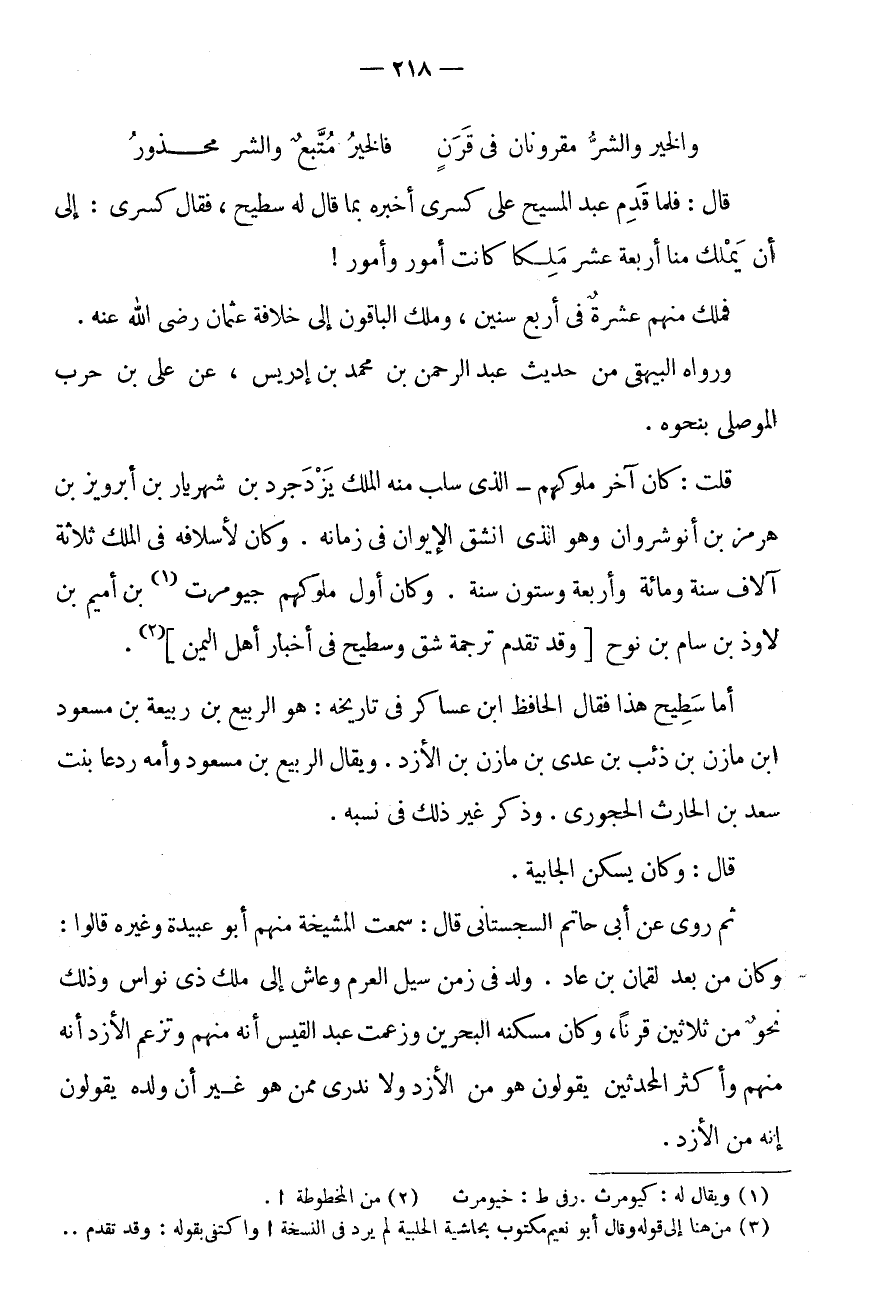 وَالْخَيرُ وَالشَّرُّ مَقْرُونَانِ فِي قَرْنٍ * فَالْخَيرُ مُتَّبَعٌ وَالشَّرُّ مَحْذُورُ قَالَ: فَلَمَّا قَدِمَ عَبْدُ الْمَسِيحِ على كسْرَى أخبرهُ بِمَا قَالَ لَهُ سَطِيحٌ، فَقَالَ كِسْرَى: إِلَى أَنْ يَمْلِكَ مِنَّا أَرْبَعَةَ عَشَرَ مَلِكًا كَانَتْ أُمُورٌ وَأُمُورٌ! فَمَلَكَ مِنْهُمْ عَشَرَةٌ فِي أَرْبَعِ سِنِينَ، وَمَلَكَ الْبَاقُونَ إِلَى خِلَافَةِ عُثْمَانَ رَضِيَ اللَّهُ عَنْهُ.