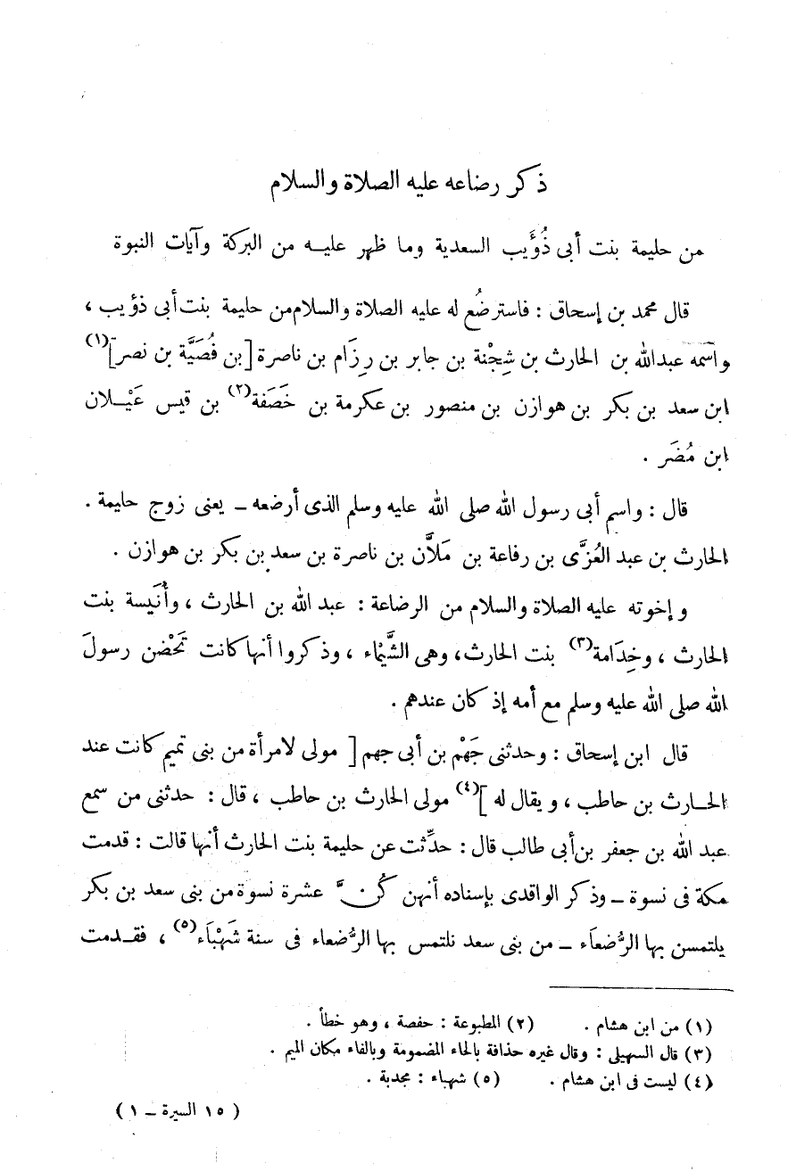 قَالَ مُحَمَّدُ بْنُ إِسْحَاق: فاسترضع لَهُ عَلَيْهِ الصَّلَاةُ وَالسَّلَامُ مِنْ حَلِيمَةَ بِنْتِ أَبِي ذُؤَيْبٍ، وَاسْمُهُ عَبْدُ اللَّهِ بْنُ الْحَارِثِ بْنِ شِجْنَةَ بْنِ جَابِرِ بْنِ رِزَامِ بْنِ ناصرة [بن فصية بن نصر] (1) ابْن سَعْدِ بْنِ بَكْرِ بْنِ هَوَازِنَ بْنِ مَنْصُورِ بن عِكْرِمَة بن خصفة (2) بن قيس عيلان ابْن مُضَرَ.