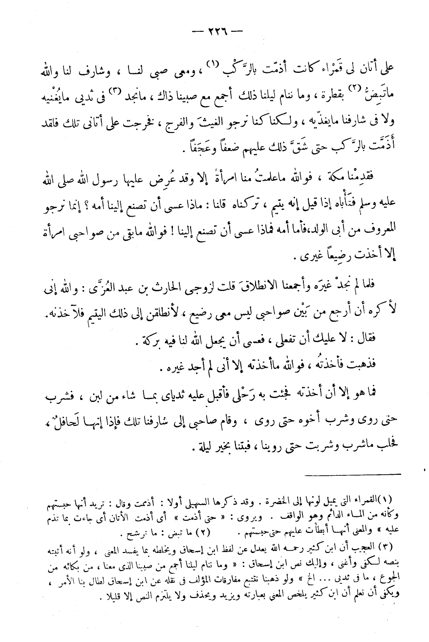 (3) الْعجب أَن ابْن كثير رَحمَه الله يعدل عَن لفظ ابْن إِسْحَاق ويخلطه بِمَا يفْسد الْمَعْنى، وَلَو أَنه أثْبته بنصه لكفى وأغنى، وَإِلَيْك نَص ابْن إِسْحَاق: " وَمَا ننام ليلنا أجمع من صبينا الذى مَعنا، من بكائه من الْجُوع، مَا فِي ثديى ... الخ " وَلَو ذَهَبْنَا نتتبع مفارقات الْمُؤلف فِي نَقله عَن ابْن إِسْحَاق لطال بِنَا الامر، ويكفى أَن نعلم أَن ابْن كثير يخلص الْمَعْنى بعبارته وَيزِيد ويحذف وَلَا يلْتَزم النَّص إِلَّا قَلِيلا.