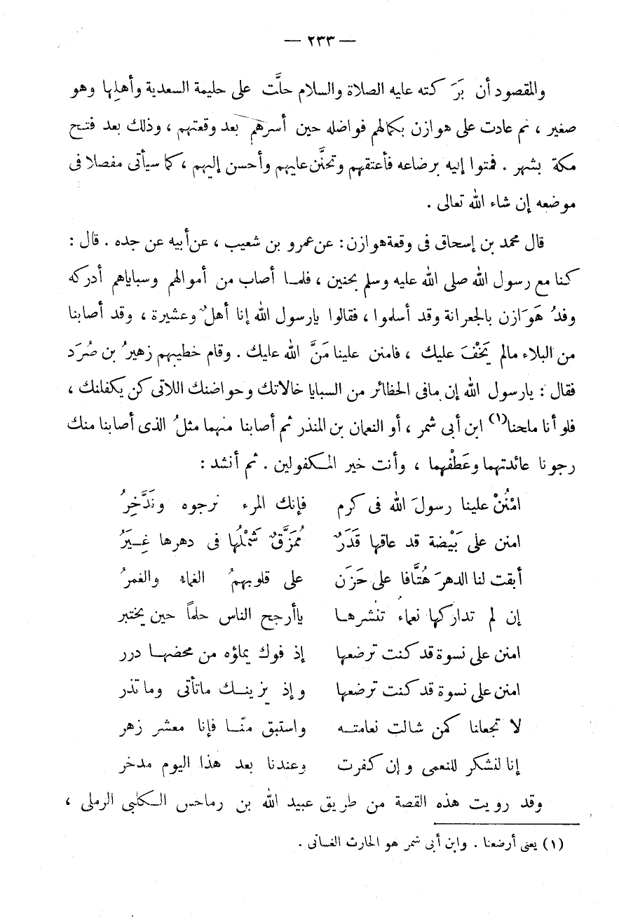 ثُمَّ أَنْشَدَ: امْنُنْ عَلَيْنَا رَسُولَ اللَّهِ فِي كَرَمٍ * فَإِنَّكَ الْمَرْءُ نَرْجُوهُ وَنَدَّخِرُ امْنُنْ عَلَى بَيْضَةٍ قَدْ عَاقَهَا قَدَرٌ * مُمَزَّقٍ شَمْلُهَا فِي دَهْرِهَا غِيَرُ أَبْقَتْ لَنَا الدَّهْرَ هُتَّافًا عَلَى حَزَنٍ * عَلَى قُلُوبِهُمُ الْغَمَّاءُ وَالْغُمَرُ إِنْ لَمْ تَدَارَكْهَا نَعْمَاءُ تَنْشُرُهَا * يَا أَرْجَحَ النَّاسِ حِلْمًا حِينَ يُخْتَبَرُ امْنُنْ عَلَى نِسْوَةٍ قَدْ كُنْتَ تَرْضَعُهَا * إِذْ فُوكَ يَمْلَؤُهُ مِنْ مَحْضِهَا دِرَرُ امْنُنْ عَلَى نِسْوةٍ قَدْ كُنْتَ تَرْضَعُهَا * وَإِذْ يَزِينُكَ مَا تَأْتِي وَمَا تَذَرُ لَا تَجْعَلَنَّا كَمَنْ شَالَتْ نَعَامَتُهُ * وَاسْتَبْقِ مِنَّا فَإِنَّا مَعْشَرٌ زُهُرُ إِنَّا لَنَشْكُرُ لِلنُّعْمَى وَإِنْ كُفِرَتْ * وَعِنْدَنَا بَعْدَ هَذَا الْيَوْمِ مُدَّخَرُ وَقَدْ رُوِيَتُ هَذِهِ الْقِصَّةُ مِنْ طَرِيقِ عُبَيْدِ اللَّهِ بْنِ رُمَاحِسٍ الْكَلْبِيِّ الرَّمْلِيّ