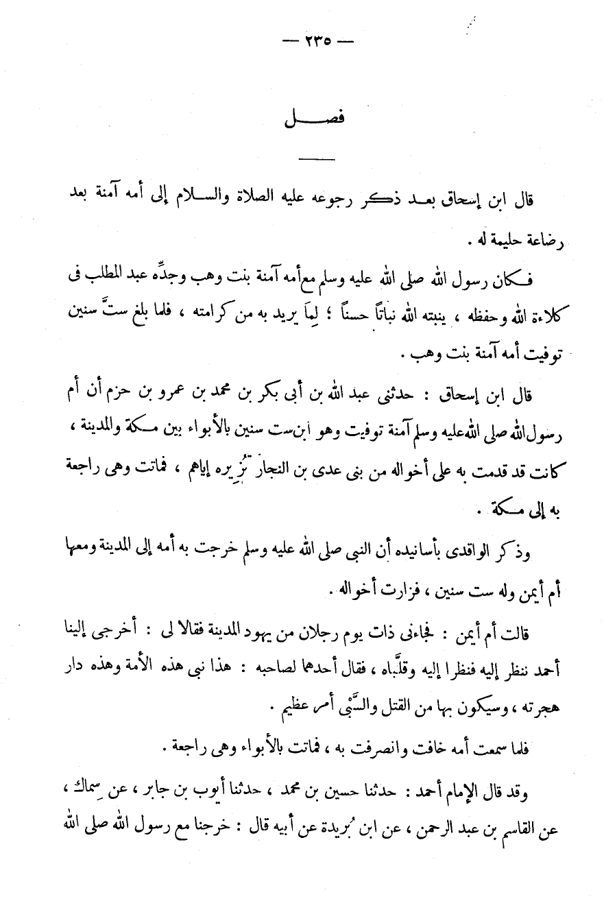 فَصْلٌ قَالَ ابْنُ إِسْحَاقَ بَعْدَ ذِكْرِ رُجُوعِهِ عَلَيْهِ الصَّلَاةُ وَالسَّلَامُ إِلَى أُمِّهِ آمِنَةَ بَعْدَ رَضَاعَةِ حَلِيمَةَ لَهُ.