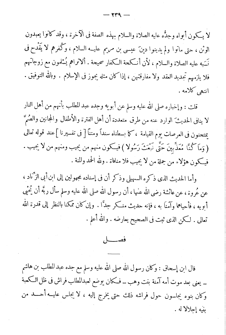 قُلْتُ: وَإِخْبَارُهُ صَلَّى اللَّهُ عَلَيْهِ وَسَلَّمَ عَنْ أَبَوَيْهِ وَجَدِّهِ عَبْدِ الْمُطَّلِبِ بِأَنَّهُمْ مِنْ أَهْلِ النَّارِ لَا يُنَافِي الْحَدِيثَ الْوَارِدَ عَنْهُ مَنْ طُرُقٍ مُتَعَدِّدَةٍ أَنَّ أَهْلَ الْفَتْرَةِ وَالْأَطْفَالَ وَالْمَجَانِينَ وَالصُّمَّ يُمْتَحَنُونَ فِي الْعَرَصَاتِ يَوْمَ الْقِيَامَةِ، كَمَا بَسَطْنَاهُ سَنَدًا وَمَتْنًا [فِي تَفْسِيرِنَا] عِنْدَ قَوْلِهِ تَعَالَى (وَمَا كُنَّا مُعَذِّبِينَ حَتَّى نَبْعَثَ رَسُولًا) فَيَكُونُ مِنْهُمْ مَنْ يُجِيبُ وَمِنْهُمْ مَنْ لَا يُجِيبُ.