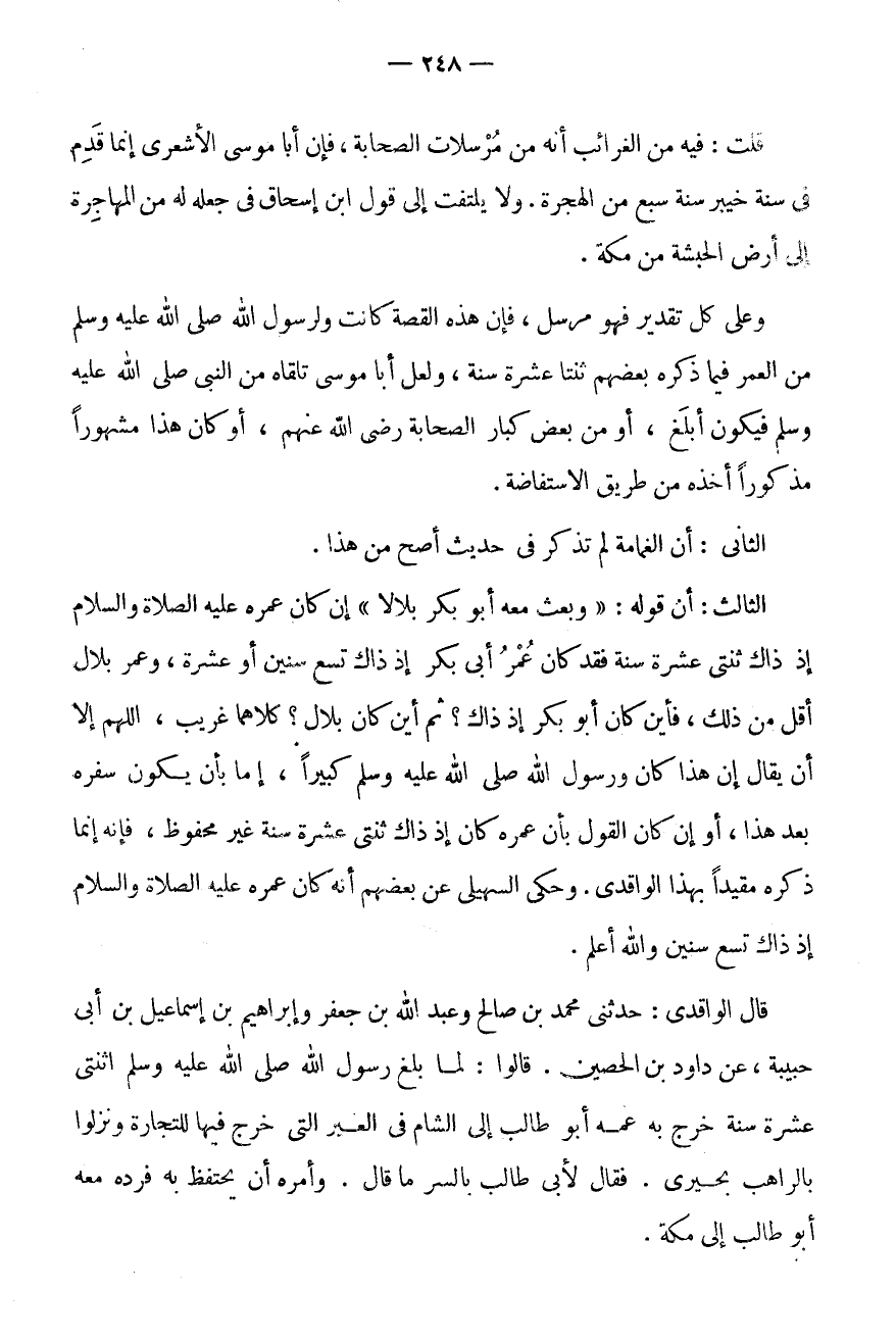 الثَّالِثُ: أَنَّ قَوْلَهُ: " وَبَعْثَ مَعَهُ أَبُو بَكْرٍ بِلَالًا " إِنْ كَانَ عُمُرُهُ عَلَيْهِ الصَّلَاةُ وَالسَّلَامُ إِذْ ذَاكَ ثِنْتَيْ عَشْرَةَ سَنَةً فَقَدْ كَانَ عُمُرُ أَبِي بَكْرٍ إِذْ ذَاكَ تِسْعَ سِنِينَ أَوْ عَشْرَةَ، وَعُمُرُ بِلَالٍ أَقَلَّ مِنْ ذَلِكَ، فَأَيْنَ كَانَ أَبُو بَكْرٍ إِذْ ذَاكَ؟ ثُمَّ أَيْنَ كَانَ بِلَالٌ؟ كِلَاهُمَا غَرِيبٌ، اللَّهُمَّ إِلَّا أَنْ يُقَالَ إِنَّ هَذَا كَانَ وَرَسُولُ الله صلى الله عَلَيْهِ وَسلم كَبِيرا، إِمَّا بِأَنْ يَكُونَ سَفَرُهُ بَعْدَ هَذَا، أَوْ إِنْ كَانَ الْقَوْلُ بِأَنَّ عُمُرَهُ كَانَ إِذْ ذَاكَ ثِنْتَيْ عَشْرَةَ سَنَةً غَيْرَ مَحْفُوظٍ، فَإِنَّهُ إِنَّمَا ذَكَرَهُ مُقَيَّدًا بِهَذَا الْوَاقِدِيُّ.