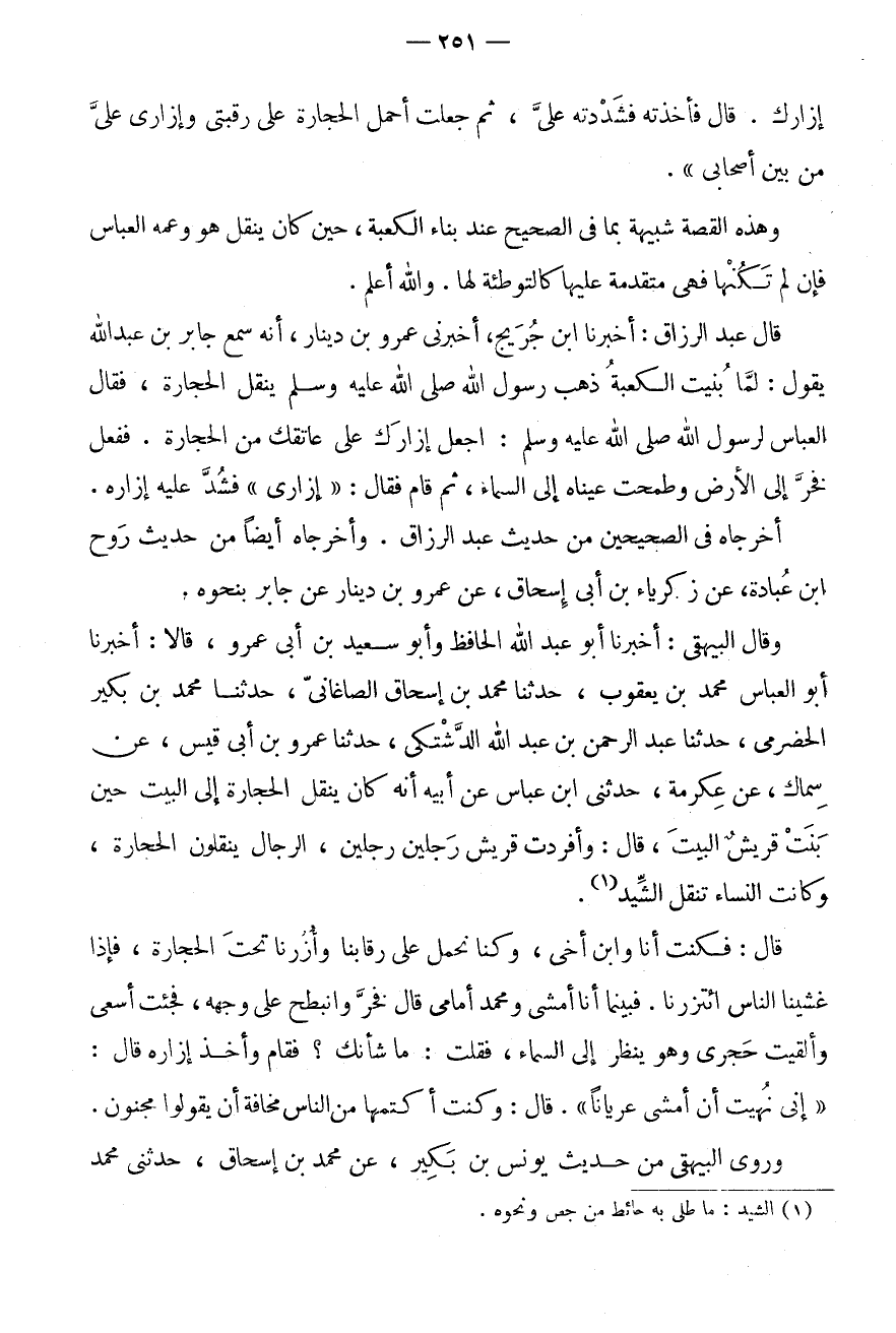 وَقَالَ الْبَيْهَقِيُّ: أَخْبَرَنَا أَبُو عَبْدِ اللَّهِ الْحَافِظُ وَأَبُو سَعِيدِ بْنُ أَبِي عَمْرٍو، قَالَا: أَخْبَرَنَا أَبُو الْعَبَّاسِ مُحَمَّدُ بْنُ يَعْقُوبَ، حَدَّثَنَا مُحَمَّدُ بْنُ إِسْحَاقَ الصَّاغَانِيُّ، حَدَّثَنَا مُحَمَّدُ بْنُ بُكَيْرٍ الْحَضْرَمِيُّ، حَدَّثَنَا عَبْدُ الرَّحْمَنِ بْنُ عَبْدِ اللَّهِ الدَّشْتَكِيُّ، حَدَّثَنَا عَمْرُو بْنُ أَبِي قَيْسٍ، عَنْ سِمَاكٍ، عَنْ عِكْرِمَةَ، حَدَّثَنِي ابْنُ عَبَّاسٍ عَنْ أَبِيهِ أَنَّهُ كَانَ يَنْقُلُ الْحِجَارَةَ إِلَى الْبَيْتِ حِينَ بَنَتْ قُرَيْشٌ الْبَيْتَ، قَالَ: وَأَفْرَدَتْ قُرَيْشٌ رَجُلَيْنِ رَجُلَيْنِ، الرِّجَالُ يَنْقُلُونَ الْحِجَارَةَ، وَكَانَتِ النِّسَاءُ تَنْقُلُ الشَّيْدَ (1) .