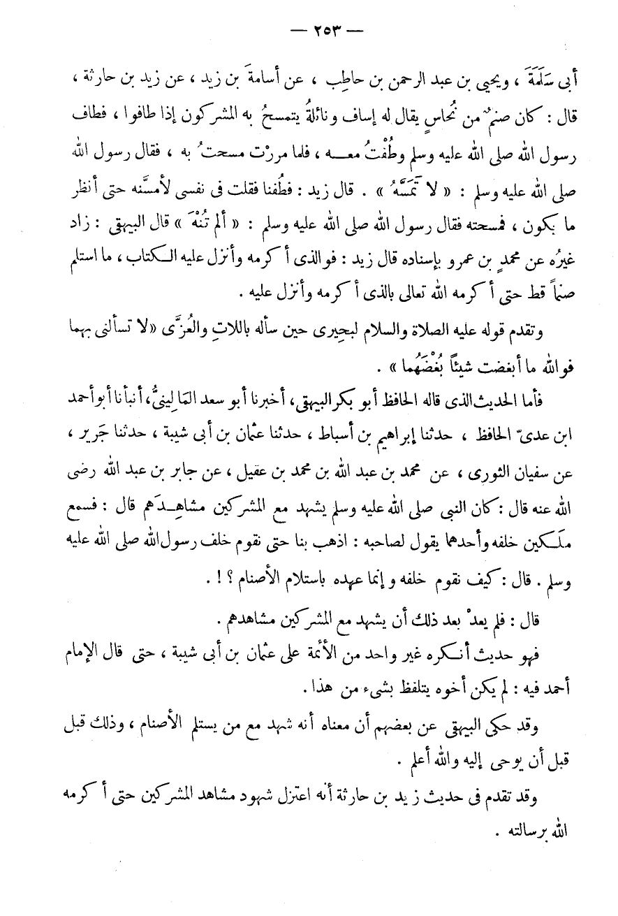 قَالَ زَيْدٌ: فَطُفْنَا فَقُلْتُ فِي نَفْسِي لَأَمَسَّنَّهُ حَتَّى أَنْظُرَ مَا يَكُونُ، فَمَسَحْتُهُ فَقَالَ رَسُولُ اللَّهِ صَلَّى اللَّهُ عَلَيْهِ وَسَلَّمَ: " أَلَمْ تُنْهَ " قَالَ الْبَيْهَقِيُّ: زَادَ غَيْرُهُ عَنْ مُحَمَّدِ بْنِ عَمْرٍو بِإِسْنَادِهِ قَالَ زيد: فو الذى أَكْرَمَهُ وَأَنْزَلَ عَلَيْهِ الْكِتَابَ، مَا اسْتَلَمَ صَنَمًا قَطُّ حَتَّى أَكْرَمَهُ اللَّهُ تَعَالَى بِالَّذِي أَكْرَمَهُ وَأَنْزَلَ عَلَيْهِ.