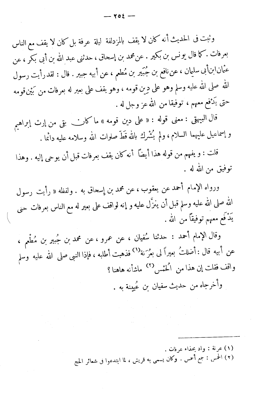 وَقَالَ الْإِمَامُ أَحْمَدُ: حَدَّثَنَا سُفْيَانُ، عَنْ عَمْرٍو، عَنْ مُحَمَّدِ بْنِ جُبَيْرِ بْنِ مُطْعِمٍ، عَنْ أَبِيهِ قَالَ: أَضْلَلْتُ بَعِيرًا لى بعرنة (1) فَذَهَبْتُ أَطْلُبُهُ، فَإِذَا النَّبِيُّ صَلَّى اللَّهُ عَلَيْهِ وَسَلَّمَ وَاقِفٌ فَقُلْتُ إِنَّ هَذَا مِنَ الْحُمْسِ (2) مَا شَأْنُهُ هَاهُنَا؟ وَأَخْرَجَاهُ مِنْ حَدِيثِ سُفْيَانَ بن عُيَيْنَة بِهِ.