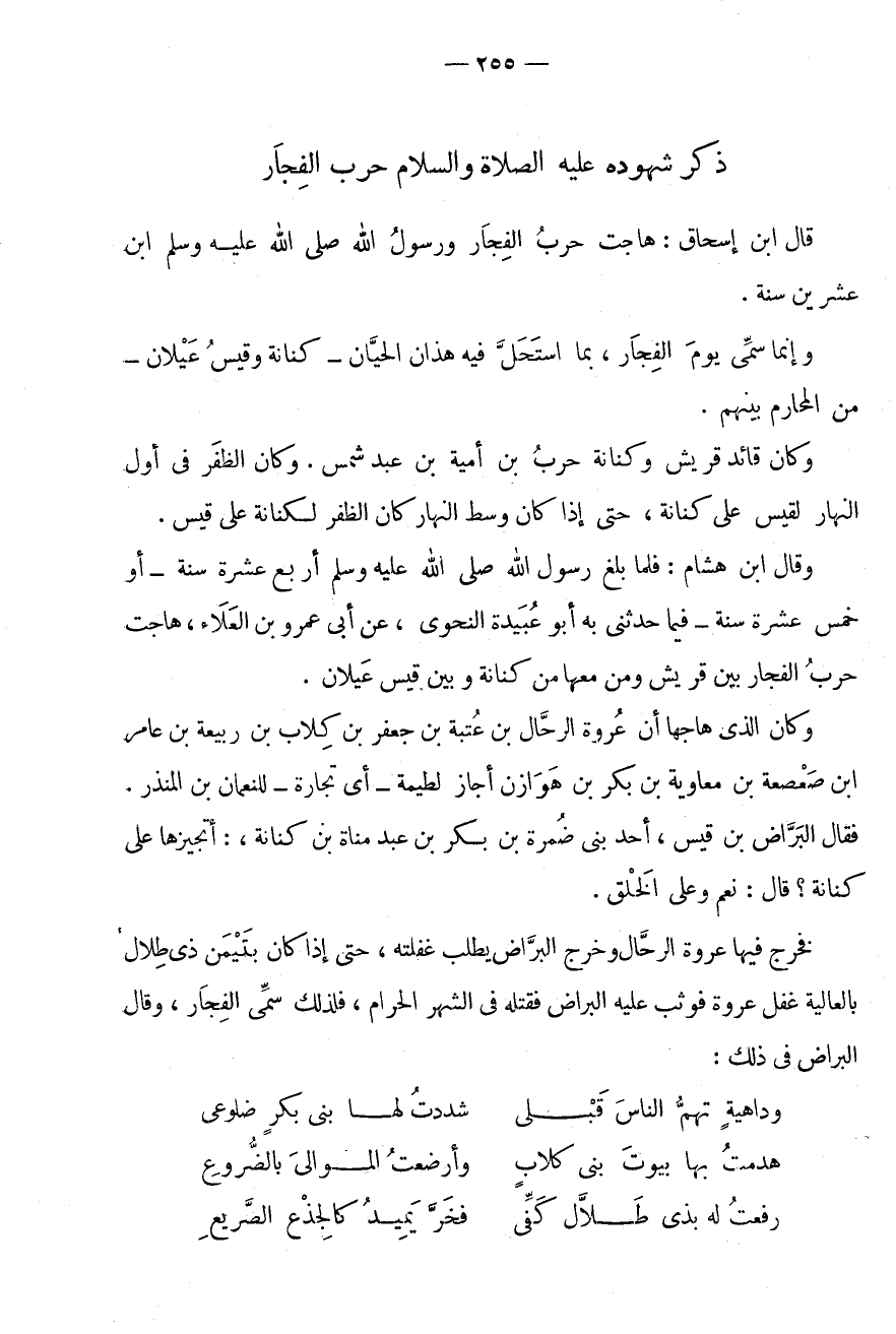 وَقَالَ ابْنُ هِشَامٍ: فَلَمَّا بَلَغَ رَسُولُ اللَّهِ صَلَّى اللَّهُ عَلَيْهِ وَسَلَّمَ أَرْبَعَ عَشْرَةَ سَنَةً - أَوْ خَمْسَ عَشْرَةَ سَنَةً - فِيمَا حَدَّثَنِي بِهِ أَبُو عُبَيْدَةَ النَّحْوِيُّ، عَنْ أَبِي عَمْرِو بْنِ الْعَلَاءِ، هَاجَتْ حَرْبُ الْفِجَارِ بَيْنَ قُرَيْشٍ وَمَنْ مَعَهَا مِنْ كِنَانَةَ وَبَيْنَ قَيْسِ عَيْلَانَ.