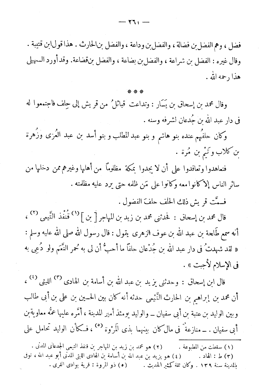قَالَ مُحَمَّدُ بْنُ إِسْحَاقَ: فَحَدَّثَنِي مُحَمَّدُ بْنُ زَيْدِ بن المُهَاجر [بن] (1) قُنْفُذٌ التَّيْمِيُّ (2) ، أَنَّهُ سَمِعَ طَلْحَةَ بْنَ عَبْدِ اللَّهِ بْنِ عَوْفٍ الزُّهْرِيَّ يَقُولُ: قَالَ رَسُولُ اللَّهِ صَلَّى اللَّهُ عَلَيْهِ وَسَلَّمَ: " لَقَدْ شَهِدْتُ فِي دَارِ عَبْدِ اللَّهِ بْنِ جُدْعَانَ حِلْفًا مَا أُحِبُّ أَنَّ لِي بِهِ حُمْرَ النَّعَمِ وَلَو دعى بِهِ فِي الْإِسْلَامِ لَأَجَبْتُ ".