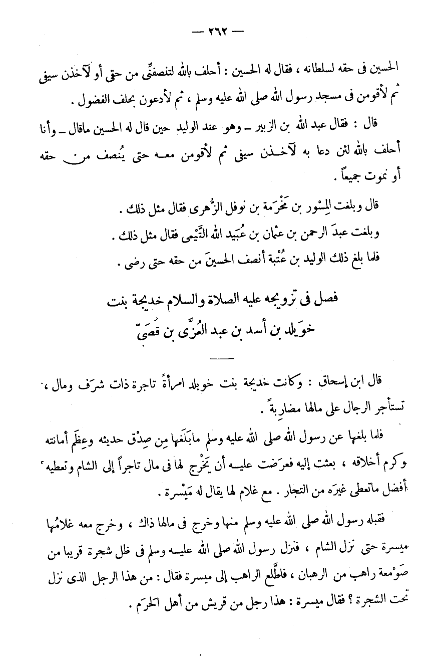 قَالَ ابْنُ إِسْحَاقَ: وَكَانَتْ خَدِيجَةُ بِنْتُ خُوَيْلِدٍ امْرَأَةً تَاجِرَةً ذَاتَ شَرَفٍ وَمَالٍ، تَسْتَأْجِرُ الرِّجَالَ عَلَى مَالِهَا مُضَارَبَةً.