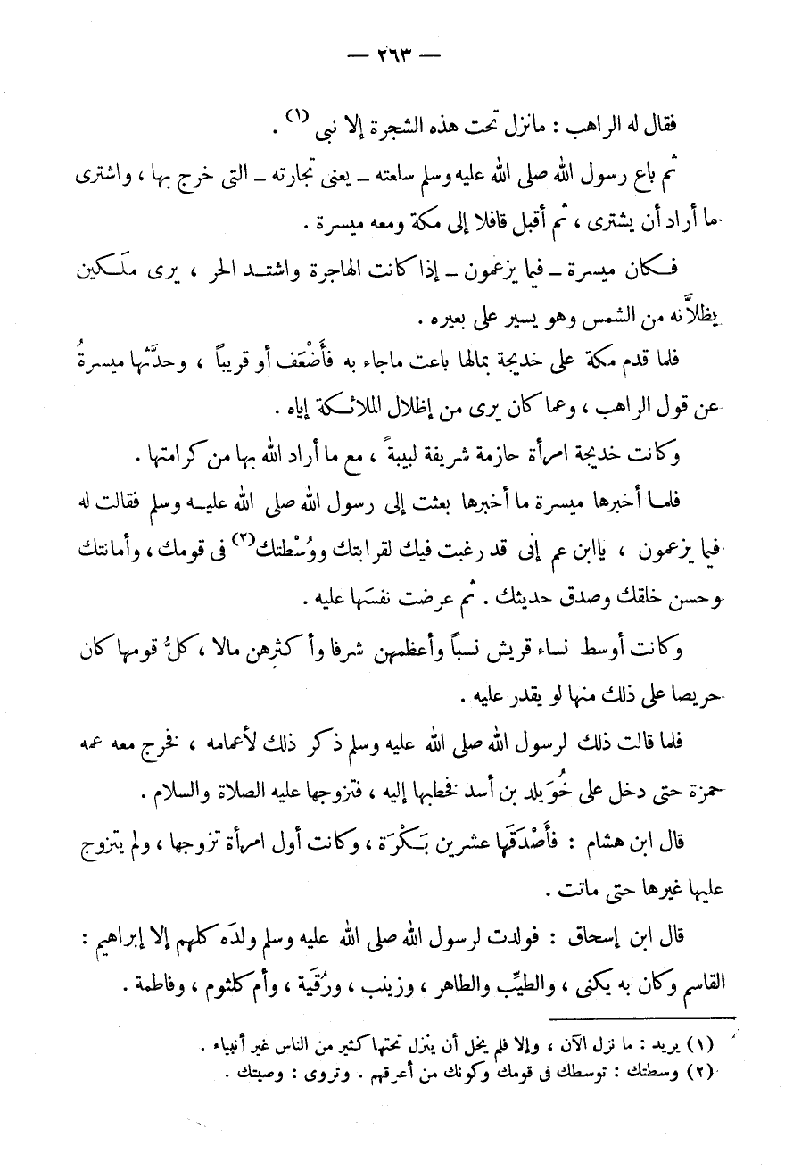 ثُمَّ بَاعَ رَسُولُ اللَّهِ صَلَّى اللَّهُ عَلَيْهِ وَسَلَّمَ سِلْعَتَهُ - يَعْنِي تِجَارَتَهُ - الَّتِي خَرَجَ بِهَا، وَاشْتَرَى مَا أَرَادَ أَنْ يَشْتَرِيَ، ثُمَّ أَقْبَلَ قَافِلًا إِلَى مَكَّةَ وَمَعَهُ مَيْسَرَةُ.