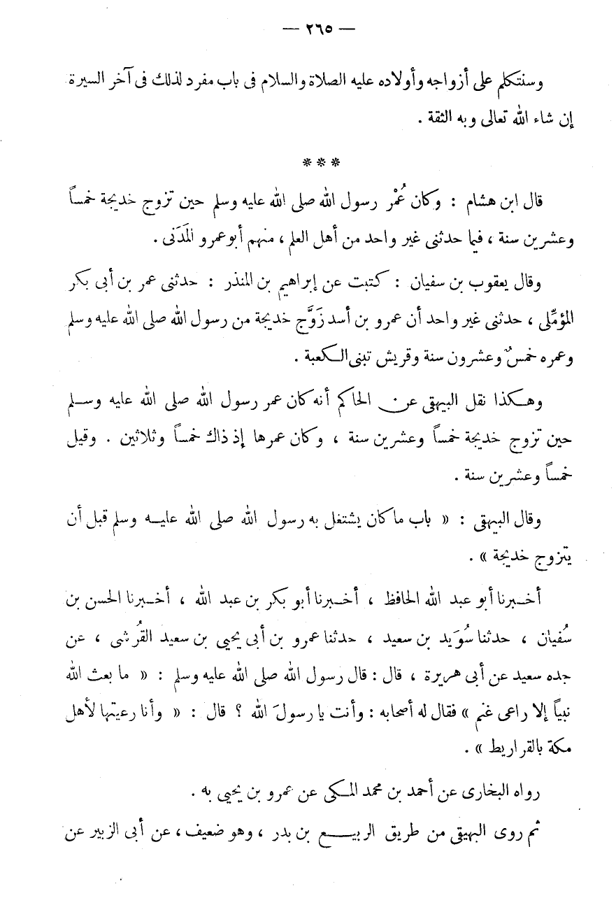 قَالَ ابْنُ هِشَامٍ: وَكَانَ عُمُرُ رَسُولِ اللَّهِ صَلَّى اللَّهُ عَلَيْهِ وَسَلَّمَ حِينَ تَزَوَّجَ خَدِيجَةَ خَمْسًا وَعِشْرِينَ سَنَةً، فِيمَا حَدَّثَنِي غَيْرُ وَاحِدٍ مِنْ أَهْلِ الْعِلْمِ، مِنْهُمْ أَبُو عَمْرٍو الْمَدَنِيُّ.
