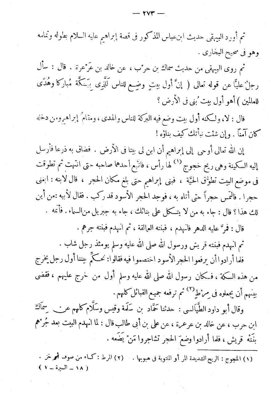 وَقَالَ أَبُو دَاوُدَ الطَّيَالِسِيُّ: حَدَّثَنَا حَمَّادُ بْنُ سَلَمَةَ وَقَيْسٌ وَسَلَّامٌ كُلُّهُمْ عَنْ سِمَاكِ ابْن حَرْبٍ، عَنْ خَالِدِ بْنِ عَرْعَرَةَ، عَنْ عَلِيِّ بْنِ أَبِي طَالِبٍ قَالَ: لَمَّا انْهَدَمَ الْبَيْتُ بَعْدَ جُرْهُمٍ بَنَتْهُ قُرَيْشٌ، فَلَمَّا أَرَادُوا وَضْعَ الْحَجَرِ تَشَاجَرُوا مَنْ يَضَعهُ.