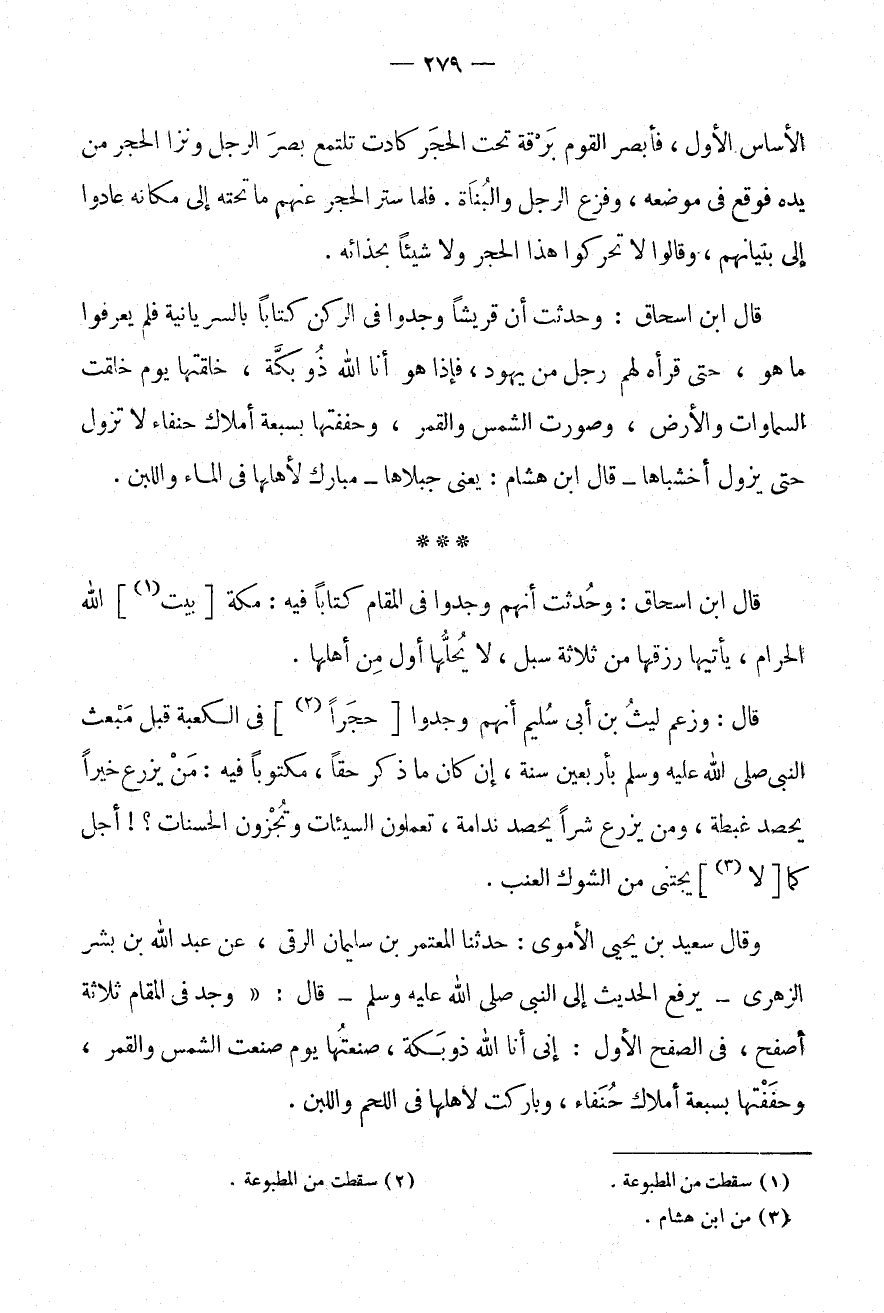 قَالَ ابْنُ إِسْحَاقَ: وَحُدِّثْتُ أَنَّ قُرَيْشًا وَجَدُوا فِي الرُّكْنِ كتابا بالسُّرْيَانيَّة فَلم يعرفوا مَا هُوَ، حَتَّى قَرَأَهُ لَهُمْ رَجُلٌ مِنْ يَهُودَ، فَإِذَا هُوَ أَنَا اللَّهُ ذُو بَكَّةَ، خَلَقْتُهَا يَوْمَ خَلَقْتُ السَّمَاوَاتِ وَالْأَرْضَ، وَصَوَّرْتُ الشَّمْسَ وَالْقَمَرَ، وَحَفَفْتُهَا بِسَبْعَةِ أَمْلَاكٍ حُنَفَاءَ لَا تَزُولُ حَتَّى يَزُولَ أَخْشَبَاهَا - قَالَ ابْنُ هِشَامٍ: يَعْنِي جَبَلَاهَا - مُبَارَكٌ لِأَهْلِهَا فِي الْمَاءِ وَاللَّبَنِ.