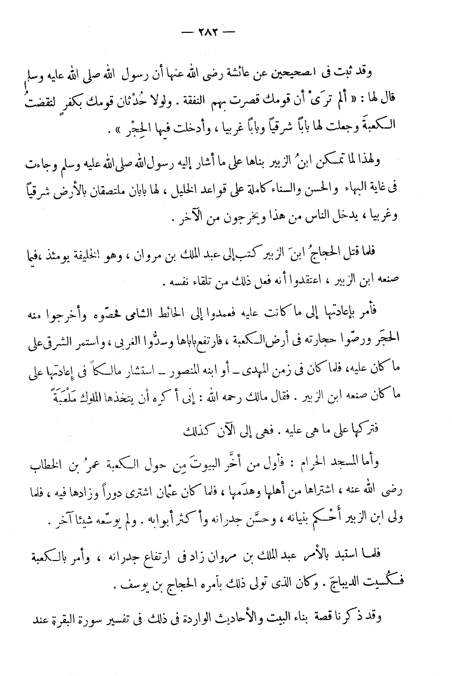 فَهِيَ إِلَى الْآنِ كَذَلِكَ وَأَمَّا الْمَسْجِدُ الْحَرَامُ: فَأَوَّلُ مَنْ أَخَّرَ الْبُيُوتَ مِنْ حَوْلِ الْكَعْبَةِ عُمَرُ بْنُ الْخَطَّابِ رَضِيَ اللَّهُ عَنْهُ، اشْتَرَاهَا مَنْ أَهْلِهَا وَهَدَمَهَا، فَلَمَّا كَانَ عُثْمَانُ اشْتَرَى دُورًا وَزَادَهَا فِيهِ، فَلَمَّا وَلِيَ ابْنُ الزُّبَيْرِ أَحْكَمَ بُنْيَانَهُ، وَحَسَّنَ جُدْرَانَهُ وَأَكْثَرَ أَبْوَابَهُ.
