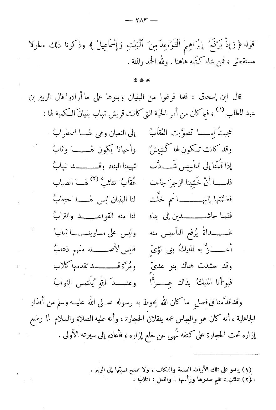 إِذَا قُمْنَا إِلَى التَّأْسِيسِ شَدَّتْ * تُهَيِّبُنَا الْبِنَاءَ وَقَدْ نَهَابُ فَلَمَّا أَن خشينا الزّجر جَاءَتْ * عُقَابٌ تَتْلَئِبُّ (2) لَهَا انْصِبَابُ فَضَمَّتْهَا إِلَيْهَا ثُمَّ خَلَّتْ لَنَا الْبُنْيَانَ لَيْسَ لَهَا حِجَابُ فَقُمْنَا حَاشِدِينَ إِلَى بِنَاءٍ * لَنَا مِنْهُ الْقَوَاعِدُ وَالتُّرَاب غَدَاة يرفع التَّأْسِيسَ مِنْهُ * وَلَيْسَ عَلَى مُسَاوِينَا ثِيَابُ أَعَزَّ بِهِ الْمَلِيكُ بَنِي لُؤَيٍّ * فَلَيْسَ لِأَصْلِهِ مِنْهُمْ ذَهَابُ وَقَدْ حَشَدَتْ هُنَاكَ بَنُو عَدِيٍّ * وَمُرَّةُ قَدْ تَقَدَّمَهَا كِلَابُ فَبَوَّأَنَا الْمَلِيكُ بِذَاكَ عِزًّا * وَعِنْدِ اللَّهِ يُلْتَمَسُ الثَّوَابُ وَقَدْ قَدَّمْنَا فِي فصل مَا كَانَ الله يحوط بِهِ رَسُوله صَلَّى اللَّهُ عَلَيْهِ وَسَلَّمَ مِنْ أَقْذَارِ الْجَاهِلِيَّةِ، أَنَّهُ كَانَ هُوَ وَالْعَبَّاسُ عَمُّهُ يَنْقُلَانِ الْحِجَارَةَ، وَأَنَّهُ عَلَيْهِ الصَّلَاةُ وَالسَّلَامُ لَمَّا وَضَعَ إِزَارَهُ تَحْتَ الْحِجَارَةِ عَلَى كَتِفِهِ نُهِيَ عَنْ خَلْعِ إزَاره، فَأَعَادَهُ إِلَى سيرته الاولى.