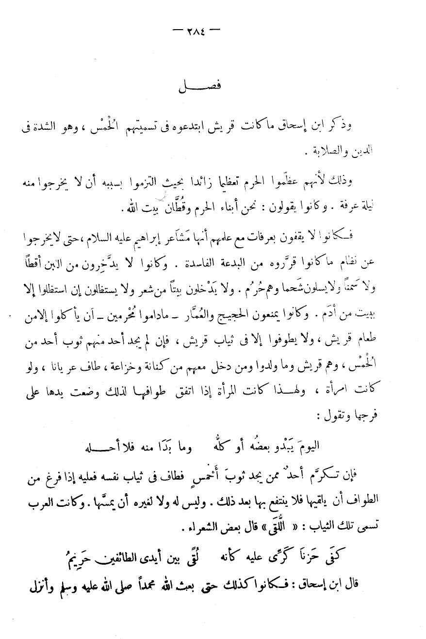 فَصْلٌ وَذَكَرَ ابْنُ إِسْحَاقَ مَا كَانَتْ قُرَيْشٌ ابْتَدَعُوهُ فِي تَسْمِيَتِهِمُ الْحُمْسَ، وَهُوَ الشِّدَّةُ فِي الدِّينِ وَالصَّلَابَةُ.