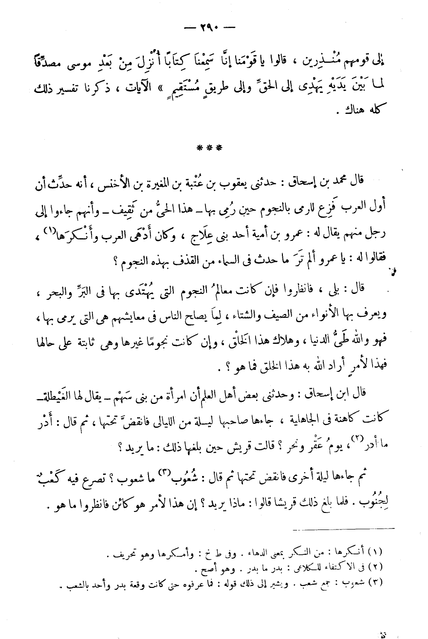 قَالَ مُحَمَّدُ بْنُ إِسْحَاقَ: حَدَّثَنِي يَعْقُوبُ بْنُ عُتْبَةَ بْنِ الْمُغِيرَةِ بْنِ الْأَخْنَسِ، أَنَّهُ حُدِّثَ أَنَّ أَوَّلَ الْعَرَبِ فَزِعَ لِلرَّمْيِ بِالنُّجُومِ حِينَ رُمِيَ بِهَا - هَذَا الْحَيُّ مِنْ ثَقِيفٍ - وَأَنَّهُمْ جَاءُوا إِلَى رَجُلٍ مِنْهُمْ يُقَالَ لَهُ: عَمْرُو بْنُ أُمَيَّةَ أَحَدُ بَنِي عِلَاجٍ، وَكَانَ أَدْهَى الْعَرَبِ وَأَنْكَرَهَا (1) ، فَقَالُوا لَهُ: يَا عَمْرُو أَلَمْ تَرَ مَا حَدَثَ فِي السَّمَاءِ مِنَ الْقَذْفِ بِهَذِهِ النُّجُومِ؟ قَالَ: بَلَى، فَانْظُرُوا فَإِنْ كَانَتْ مَعَالِمُ النُّجُومِ الَّتِي يُهْتَدَى بِهَا فِي الْبَرِّ وَالْبَحْرِ، وَيُعْرَفُ بِهَا الْأَنْوَاءُ مِنَ الصَّيْفِ وَالشِّتَاءِ، لِمَا يُصْلِحُ النَّاسَ فِي مَعَايِشِهِمْ هِيَ الَّتِي يُرْمَى بِهَا، فَهُوَ وَاللَّهِ طَيُّ الدُّنْيَا، وَهَلَاكُ هَذَا الْخَلْقِ، وَإِنْ كَانَتْ نُجُومًا غَيْرَهَا وَهِيَ ثَابِتَةٌ عَلَى حَالِهَا فَهَذَا لِأَمْرٍ أَرَادَ اللَّهُ بِهِ هَذَا الْخلق فَمَا هُوَ؟.