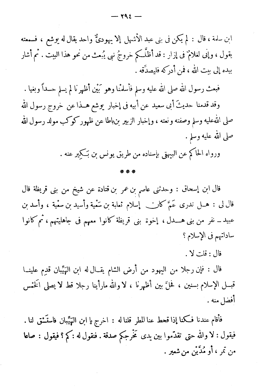 قَالَ ابْنُ إِسْحَاقَ: وَحَدَّثَنِي عَاصِمُ بْنُ عُمَرَ بْنِ قَتَادَةَ عَنْ شَيْخٍ مِنْ بَنِي قُرَيْظَةَ قَالَ قَالَ لِي: هَلْ تَدْرِي عَمَّ كَانَ إِسْلَامُ ثَعْلَبَةَ بْنِ سَعْيَةَ وَأُسَيْدِ بْنِ سَعْيَةَ، وَأَسَدِ بْنِ عُبَيْدٍ - نَفَرٍ مِنْ بَنِي هَدْلٍ، إِخْوَةِ بَنِي قُرَيْظَةَ كَانُوا مَعَهُمْ فِي جَاهِلِيَّتِهِمْ، ثمَّ كَانُوا ساداتهم فِي الْإِسْلَامِ؟ قَالَ: قُلْتُ لَا.