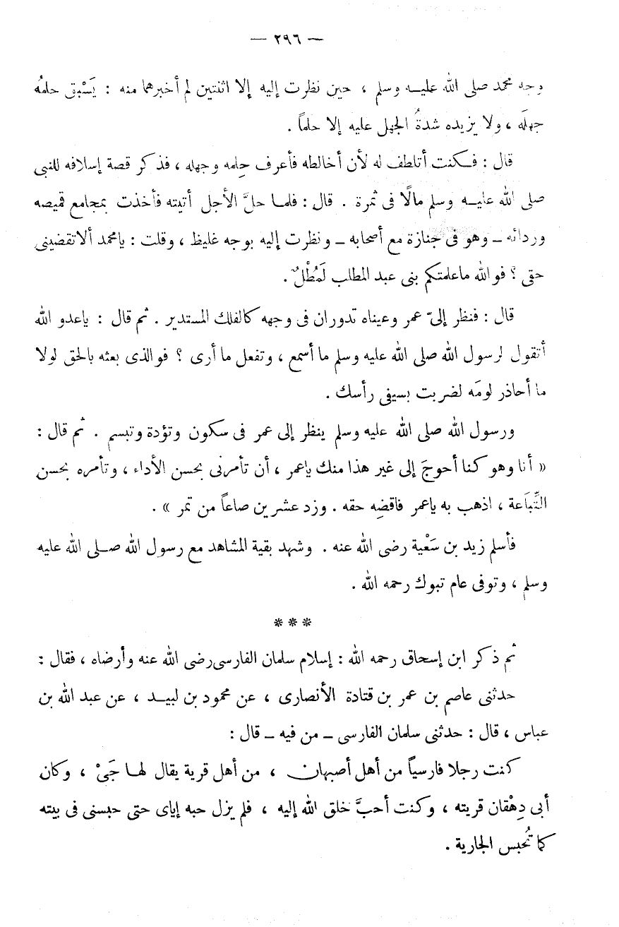 ثُمَّ ذَكَرَ ابْنُ إِسْحَاقَ رَحِمَهُ اللَّهُ: إِسْلَامَ سَلْمَانَ الْفَارِسِيِّ رَضِيَ اللَّهُ عَنْهُ وَأَرْضَاهُ، فَقَالَ: حَدَّثَنِي عَاصِمُ بْنُ عُمَرَ بْنِ قَتَادَةَ الْأَنْصَارِيُّ، عَنْ مَحْمُودِ بْنِ لَبِيدٍ، عَنْ عَبْدِ اللَّهِ بْنِ عَبَّاسٍ، قَالَ: حَدَّثَنِي سَلْمَانُ الْفَارِسِيُّ - مِنْ فِيهِ - قَالَ: كُنْتُ رَجُلًا فَارِسِيًّا مِنْ أَهْلِ أَصْبَهَانَ، مِنْ أَهْلِ قَرْيَة يُقَال لَهَا جى، وَكَانَ أَبِي دِهْقَانَ قَرْيَتِهِ، وَكُنْتُ أَحَبَّ خَلْقِ الله إِلَيْهِ، فَلم يزل حبه إيادى حَتَّى حَبَسَنِي فِي بَيْتِهِ كَمَا تُحْبَسُ الْجَارِيَةُ.
