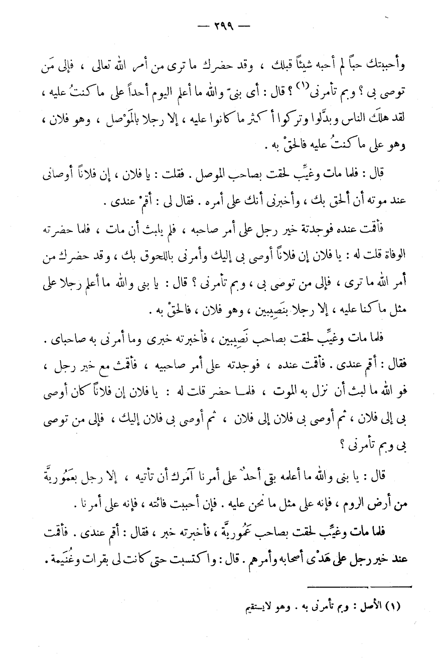فَأَقَمْتُ عِنْده، فَوَجَدته على أَمر صَاحِبيهِ، فأقمث مَعَ خير رجل، فو الله مَا لَبِثَ أَنْ نَزَلَ بِهِ الْمَوْتُ، فَلَمَّا حَضَرَ قُلْتُ لَهُ: يَا فُلَانُ إِنَّ فُلَانًا كَانَ أَوْصَى بِي إِلَى فُلَانٍ، ثُمَّ أَوْصَى بِي فُلَانٌ إِلَى فُلَانٍ، ثُمَّ أَوْصَى بِي فُلَانٌ إِلَيْكَ، فَإِلَى مَنْ تُوصِي بِي وَبِمَ تَأْمُرُنِي؟