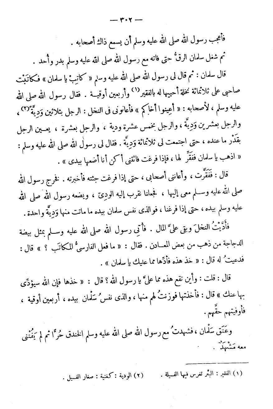 قَالَ سَلْمَانُ: ثُمَّ قَالَ لِي رَسُولُ اللَّهِ صَلَّى اللَّهُ عَلَيْهِ وَسَلَّمَ " كَاتِبْ يَا سَلْمَانُ " فَكَاتَبْتُ صَاحِبِي عَلَى ثَلَاثِمِائَةِ نَخْلَةٍ أُحْيِيهَا لَهُ بِالْفَقِيرِ (1) وَأَرْبَعِينَ أُوقِيَّةً.