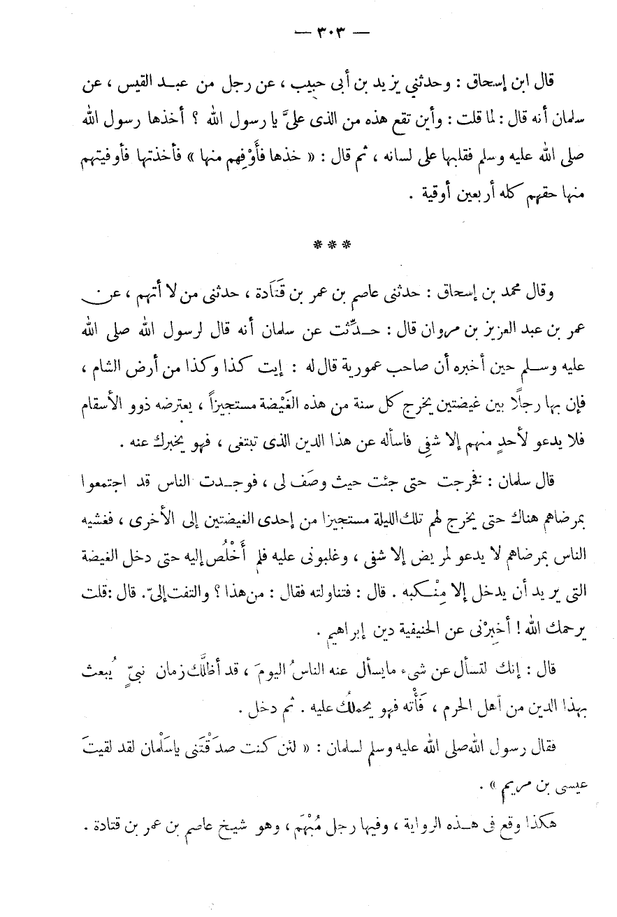 وَقَالَ مُحَمَّدُ بْنُ إِسْحَاقَ: حَدَّثَنِي عَاصِمُ بْنُ عُمَرَ بْنِ قَتَادَةَ، حَدَّثَنِي مَنْ لَا أَتَّهِمُ، عَنْ عُمَرَ بْنِ عَبْدِ الْعَزِيزِ بْنِ مَرْوَانَ قَالَ: حُدِّثْتُ عَنْ سَلْمَانَ أَنَّهُ قَالَ لِرَسُولِ اللَّهِ صَلَّى اللَّهُ عَلَيْهِ وَسَلَّمَ حِينَ أخبرهُ أَن صَاحب عمورية قَالَ لَهُ: إيت كَذَا وَكَذَا مِنْ أَرْضِ الشَّامِ، فَإِنَّ بِهَا رَجُلًا بَيْنَ غَيْضَتَيْنِ يَخْرُجُ كُلَّ سَنَةٍ مِنْ هَذِهِ الْغَيْضَةِ مُسْتَجِيزًا، يَعْتَرِضُهُ ذَوُو الْأَسْقَامِ فَلَا يَدْعُو لِأَحَدٍ مِنْهُمْ إِلَّا شُفِيَ فَاسْأَلْهُ عَنْ هَذَا الدِّينِ الَّذِي تَبْتَغِي، فَهُوَ يُخْبِرُكَ عَنْهُ.