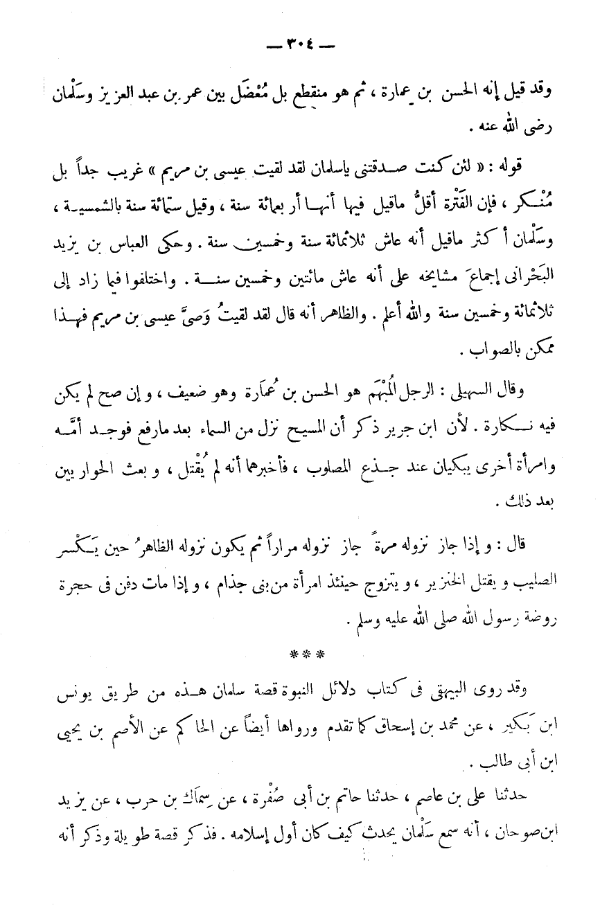 قَوْله: " لَئِنْ كُنْتَ صَدَقْتَنِي يَا سَلْمَانُ لِقَدْ لَقِيتَ عِيسَى بن مَرْيَمَ " غَرِيبٌ جِدًّا بَلْ مُنْكَرٌ، فَإِنَّ الْفَتْرَةَ أَقَلُّ مَا قِيلَ فِيهَا أَنَّهَا أَرْبَعُمِائَةِ سَنَةٍ، وَقِيلَ سِتُّمِائَةِ سَنَةٍ بِالشَّمْسِيَّةِ، وَسَلْمَانُ أَكْثَرُ مَا قِيلَ أَنَّهُ عَاشَ ثَلَاثَمِائَةِ سَنَةٍ وَخَمْسِينَ سَنَةً.