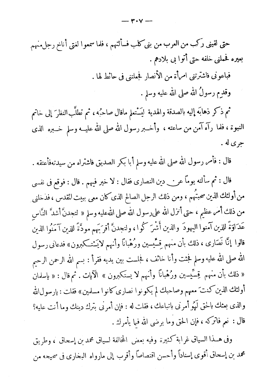 قَالَ: فَوَقَعَ فِي نَفْسِي مِنْ أُولَئِكَ الَّذِينَ صَحِبْتُهُمْ، وَمِنْ ذَلِكَ الرَّجُلِ الصَّالِحِ الَّذِي كَانَ مَعِي بِبَيْتِ الْمَقْدِسِ، فَدَخَلَنِي مِنْ ذَلِكَ أَمْرٌ عَظِيمٌ، حَتَّى أَنْزَلَ اللَّهُ عَلَى رَسُولِ اللَّهِ صَلَّى اللَّهُ عَلَيْهِ وَسَلَّمَ " لَتَجِدَنَّ أَشَدَّ النَّاسِ عَدَاوَةً لِلَّذِينَ آمَنُوا الْيَهُودَ وَالَّذِينَ أَشْرَكُوا، وَلَتَجِدَنَّ أَقْرَبَهُمْ مَوَدَّةً لِلَّذِينَ آمَنُوا الَّذِينَ قَالُوا إِنَّا نَصَارَى، ذَلِكَ بِأَنَّ مِنْهُمْ قِسِّيسِينَ وَرُهْبَانًا وَأَنَّهُمْ لَا يَسْتَكْبِرُونَ " فَدَعَانِي رَسُولُ اللَّهِ صَلَّى اللَّهُ عَلَيْهِ وَسَلَّمَ فَجِئْتُ وَأَنَا خَائِفٌ، فَجَلَسْتُ بَيْنَ يَدَيْهِ فَقَرَأَ: بِسْمِ اللَّهِ الرَّحْمَنِ الرَّحِيمِ " ذَلِكَ بِأَنَّ مِنْهُمْ قِسِّيسِينَ وَرُهْبَانًا وَأَنَّهُمْ لَا يَسْتَكْبِرُونَ " الْآيَاتِ.