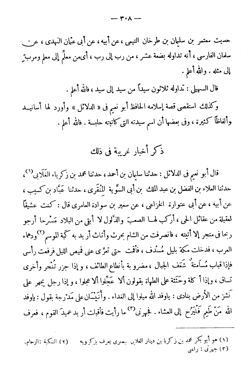 قَالَ أَبُو نُعَيْمٍ فِي الدَّلَائِلِ: حَدَّثَنَا سُلَيْمَانُ بن أَحْمد، حَدثنَا مُحَمَّد بن زَكَرِيَّاء الْغَلَابِيُّ (1) ، حَدَّثَنَا الْعَلَاءُ بْنُ الْفَضْلِ بْنِ عَبْدِ الْملك بن أَبى السوية الْمِنْقَرِيُّ، حَدَّثَنَا عَبَّادُ بْنُ كُسَيْبٍ، عَنْ أَبِيهِ، عَن أَبى عتوارة الخزاعى، عَن سعير بن سوَادَة العامري قَالَ: كنت عشيقا لِعَقِيلَةٍ مِنْ عَقَائِلِ الْحَيِّ، أَرْكَبُ لَهَا الصَّعْبَ والذلول لَا أبقى من الْبِلَاد مسرحا أَرْجُو رِبْحًا فِي مَتْجَرٍ إِلَّا أَتَيْتُهُ، فَانْصَرَفْتُ من الشَّام بحرث وَأَثَاثٍ أُرِيدُ بِهِ كُبَّةَ الْمَوْسِمِ (2) وَدَهْمَاءَ الْعَرَبِ، فَدَخَلْتُ مَكَّةَ بِلَيْلٍ مُسْدِفٍ، فَأَقَمْتُ حَتَّى تَعَرَّى عَنِّي قَمِيصُ اللَّيْلِ فَرَفَعْتُ رَأْسِي فَإِذَا قِبَابٌ مُسَامِتَةٌ شَعَفَ الْجِبَالِ، مَضْرُوبَةٌ بِأَنْطَاعِ الطَّائِفِ، وَإِذَا جزر تُنْحَرُ وَأُخْرَى تُسَاقُ، وَإِذَا أَكَلَةٌ وَحَثَثَةٌ عَلَى الطُّهَاةِ يَقُولُونَ أَلَا عَجِّلُوا أَلَا عَجَّلُوا، وَإِذَا رجل يجْهر على نشر مِنَ الْأَرْضِ يُنَادِي: يَا وَفْدَ اللَّهِ مِيلُوا إِلَى الْغَدَاءِ.