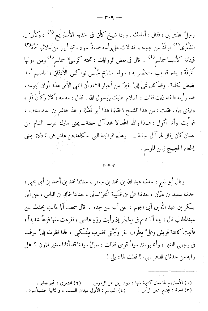 الشِّعْرَى (2) تَوَقَّدُ مِنْ جَبِينِهِ، قَدْ لَاثَ عَلَى رَأْسِهِ عِمَامَةً سَوْدَاءَ قَدْ أَبْرَزَ مِنْ مِلَائِهَا جَمَّةً (3) فَيْنَانَةً كَأَنَّهَا سَمَاسِمٌ (4) .