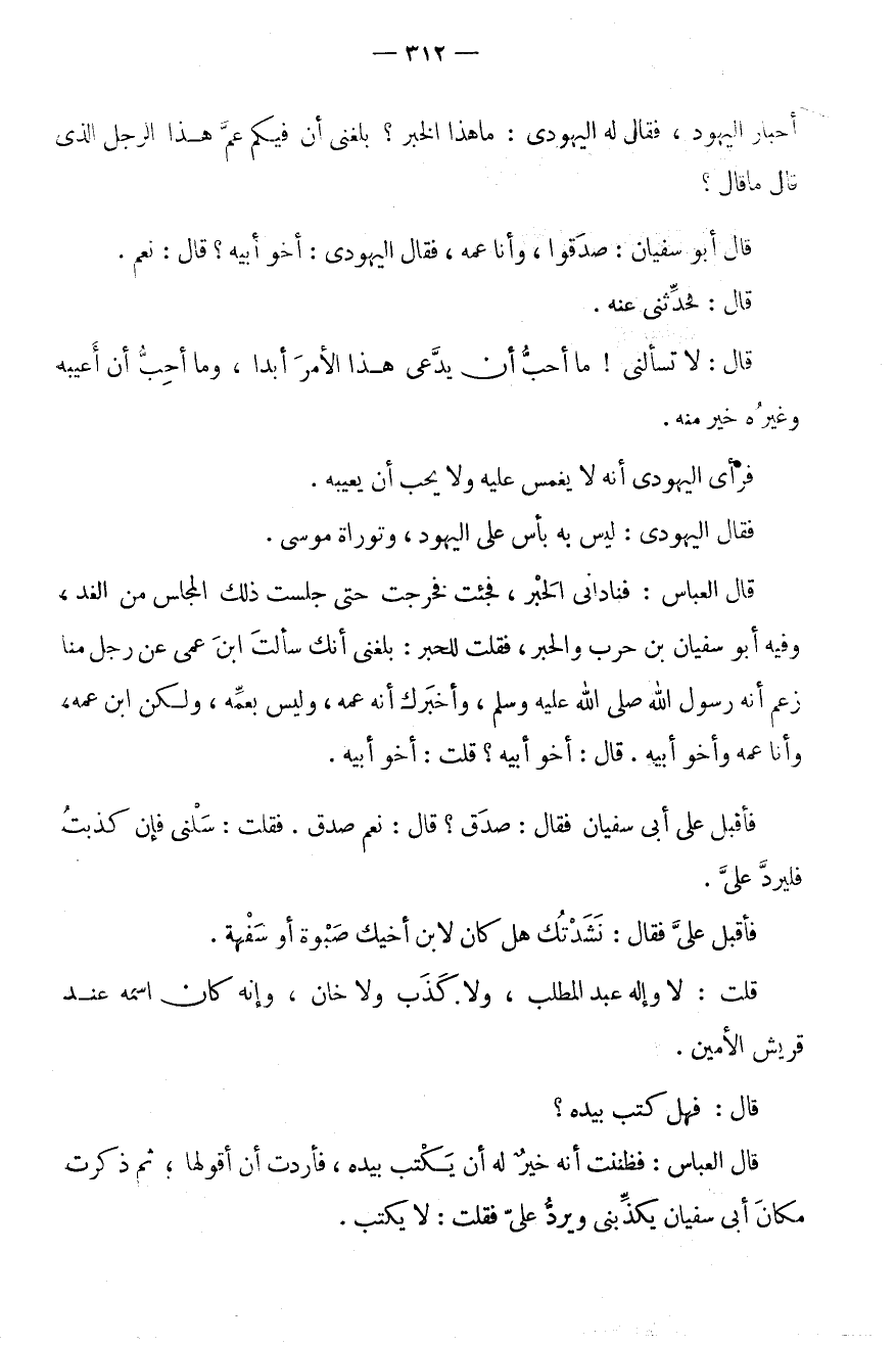 أَحْبَارِ الْيَهُودِ، فَقَالَ لَهُ الْيَهُودِيُّ: مَا هَذَا الْخَبَرُ؟ بَلَغَنِي أَنَّ فِيكُمْ عَمَّ هَذَا الرَّجُلِ الَّذِي قَالَ مَا قَالَ؟ قَالَ أَبُو سُفْيَانَ: صَدَقُوا، وَأَنَا عَمُّهُ، فَقَالَ الْيَهُودِيُّ: أَخُو أَبِيهِ؟ قَالَ: نَعَمْ.