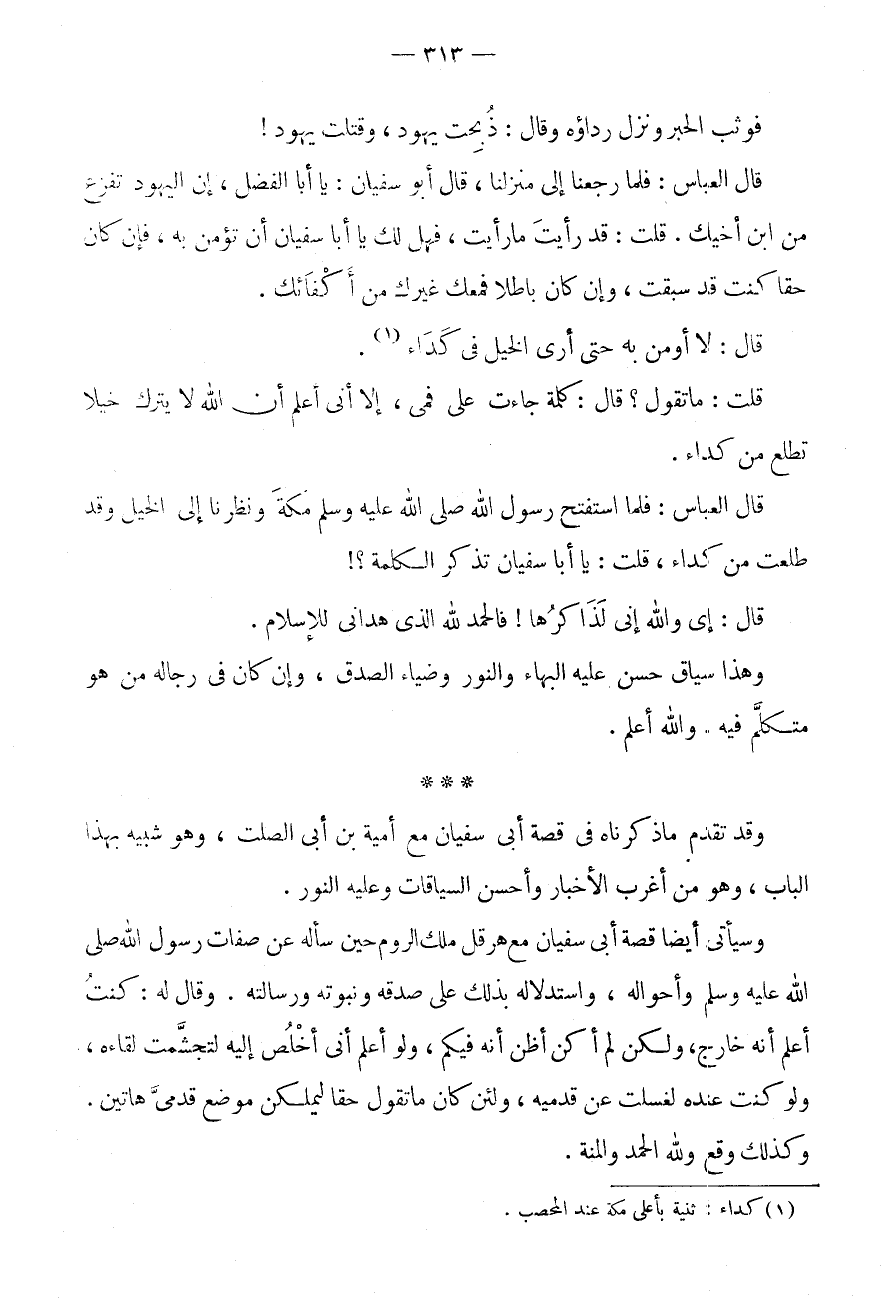 قَالَ الْعَبَّاسُ: فَلَمَّا اسْتَفْتَحَ رَسُولُ اللَّهِ صَلَّى اللَّهُ عَلَيْهِ وَسَلَّمَ مَكَّةَ وَنَظَرْنَا إِلَى الْخَيْلِ وَقَدْ طَلَعَتْ مِنْ كَدَاءٍ، قُلْتُ: يَا أَبَا سُفْيَانَ تَذْكُرُ الْكَلِمَةَ؟ ! قَالَ: إِي وَاللَّهِ إِنِّي لَذَاكِرُهَا! فَالْحَمْدُ لِلَّهِ الَّذِي هَدَانِي لِلْإِسْلَامِ.