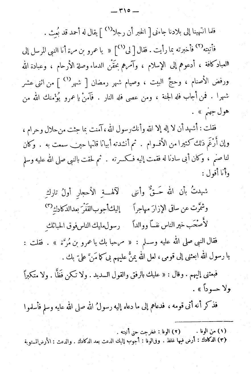 ثُمَّ لَحِقْتُ بِالنَّبِيِّ صَلَّى اللَّهُ عَلَيْهِ وَسَلَّمَ وَأَنَا أَقُولُ: شَهِدْتُ بِأَنَّ اللَّهَ حَقٌّ وَأَنَّنِي * لِآلِهَةِ الْأَحْجَارِ أَوَّلُ تَارِكِ وشمرت عَن ساقى الْإِزَارِ مُهَاجِرًا * إِلَيْكَ أَجُوبُ الْقَفْرَ بَعْدَ الدَّكَادِكِ (3) لِأَصْحَبَ خَيْرَ النَّاسِ نَفْسًا وَوَالِدًا * رَسُولَ مَلِيكِ النَّاسِ فَوْقَ الْحَبَائِكِ فَقَالَ النَّبِيُّ صَلَّى اللَّهُ عَلَيْهِ وَسَلَّمَ: " مَرْحَبًا بِكَ يَا عَمْرُو بْنَ مُرَّةَ ".