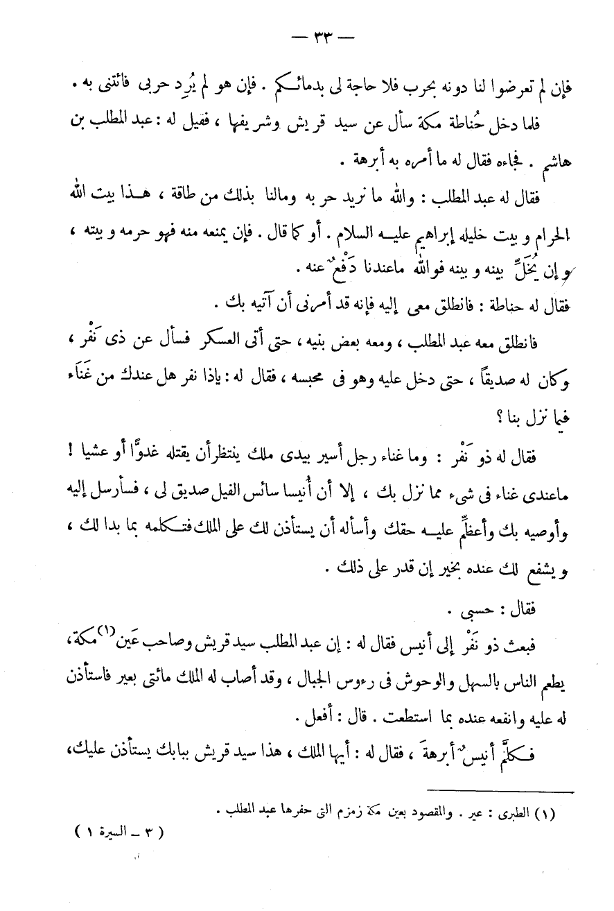 فَانْطَلَقَ مَعَهُ عَبْدُ الْمُطَّلِبِ، وَمَعَهُ بَعْضُ بَنِيهِ، حَتَّى أَتَى الْعَسْكَرَ فَسَأَلَ عَنْ ذِي نَفَرٍ، وَكَانَ لَهُ صَدِيقًا، حَتَّى دَخَلَ عَلَيْهِ وَهُوَ فِي مَحْبِسِهِ، فَقَالَ لَهُ: يَا ذَا نَفَرٍ هَلْ عِنْدَكَ مِنْ غَنَاءٍ فِيمَا نَزَلَ بِنَا؟ فَقَالَ لَهُ ذُو نَفَرٍ: وَمَا غَنَاءُ رَجُلٍ أَسِيرٍ بِيَدَيْ مَلِكٍ يَنْتَظِرُ أَنْ يَقْتُلَهُ غُدُوًّا أَوْ عَشِيًّا! مَا عِنْدِي غَنَاءٌ فِي شئ مِمَّا نَزَلَ بِكَ، إِلَّا أَنَّ أُنَيْسًا سَائِسَ الْفِيلِ صَدِيقٌ لِي، فَسَأُرْسِلُ إِلَيْهِ وَأُوصِيهِ بِكَ وَأُعَظِّمُ عَلَيْهِ حَقَّكَ وَأَسْأَلُهُ أَنْ يَسْتَأْذِنَ لَكَ عَلَى الْمَلِكِ فَتُكَلِّمَهُ بِمَا بَدَا لَكَ، وَيَشْفَعَ لَكَ عِنْدَهُ بِخَيْرٍ إِنْ قَدَرَ عَلَى ذَلِكَ.
