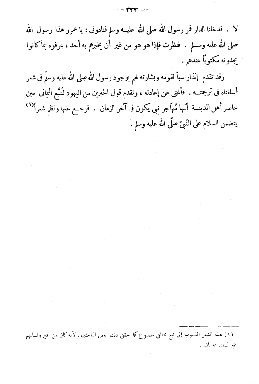 فَأَغْنَى عَنْ إِعَادَتِهِ، وَتَقَدَّمَ قَوْلُ الْحَبْرَيْنِ مِنَ الْيَهُودِ لِتُبَّعٍ الْيَمَانِيِّ حِينَ حَاصَرَ أَهْلَ الْمَدِينَةِ إِنَّهَا مُهَاجَرُ نَبِيٍّ يَكُونُ فِي آخِرِ الزَّمَانِ.