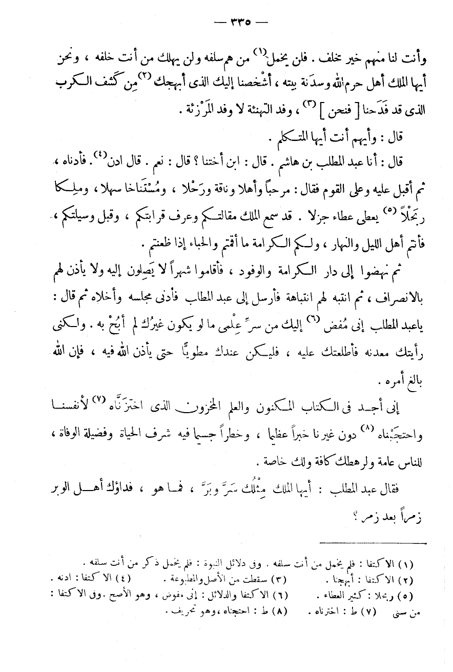 فَلَنْ يخمل (1) مَنْ هُمْ سَلَفُهُ وَلَنْ يَهْلِكَ مَنْ أَنْتَ خَلَفُهُ، وَنَحْنُ أَيُّهَا الْمَلِكُ أَهْلُ حَرَمِ اللَّهِ وسدنة بَيته، أشخصنا إِلَيْك الذى أبهجك (2) من كشف الكرب الذى قد فدحنا [فَنحْن] (3) ، وَفْدُ التَّهْنِئَةِ لَا وَفْدُ الْمَرْزِئَةِ.