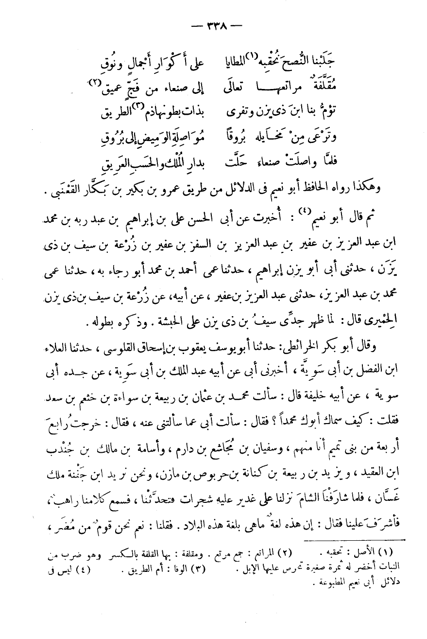 جلبنا الصنح نحقبه (1) المطايا * على أكوار أجمال ونوق مقلفة مَرَاتِعُهَا تُعَالَى * إِلَى صَنْعَاءَ مِنْ فَجٍّ عَمِيقِ (2) تؤم بِنَا ابْن ذى يزن وتفرى * بِذَات بطونها ذمّ (3) الطَّرِيق وترعى من مخايله بروقا * مُوَاصلَة الوميض إِلَى بروق فَلَمَّا واصلت صنعاء حلت * بدار الْملك والحسب العريق وَهَكَذَا رَوَاهُ الْحَافِظُ أَبُو نُعَيْمٍ فِي الدَّلَائِلِ من طَرِيق عَمْرو بن بكير بن بكار القعنبى.