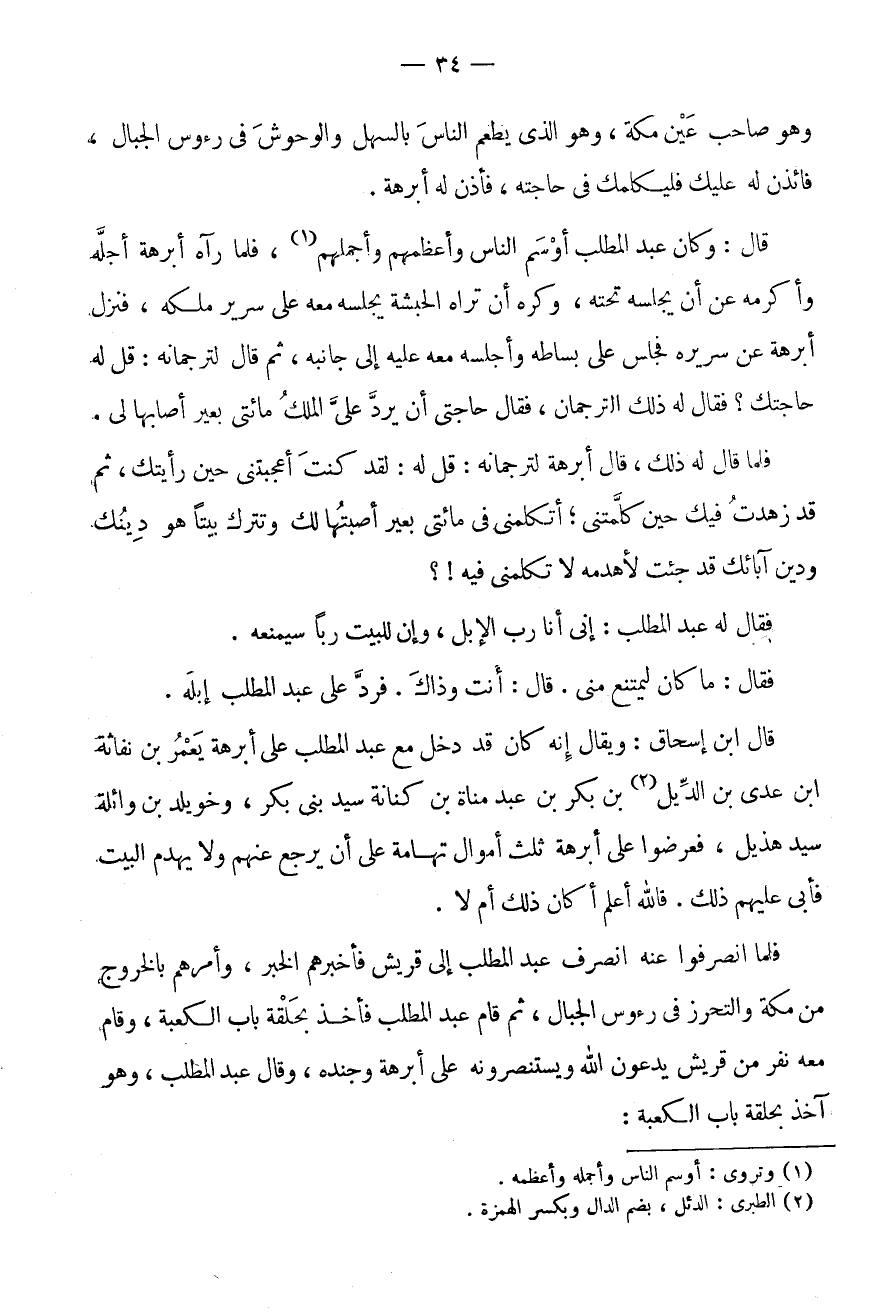 فَلَمَّا قَالَ لَهُ ذَلِكَ، قَالَ أَبْرَهَةُ لِتُرْجُمَانِهِ: قُلْ لَهُ: لَقَدْ كُنْتَ أَعْجَبْتَنِي حِينَ رَأَيْتُكَ، ثُمَّ قَدْ زَهِدْتُ فِيكَ حِينَ كَلَّمْتَنِي، أَتُكَلِّمُنِي فِي مِائَتَيْ بَعِيرٍ أَصَبْتُهَا لَكَ وَتَتْرُكُ بَيْتًا هُوَ دِينُكَ وَدِينُ آبَائِكَ قَدْ جِئْتُ لِأَهْدِمَهُ لَا تُكَلِّمُنِي فِيهِ! ؟ فَقَالَ لَهُ عَبْدُ الْمُطَّلِبِ: إِنِّي أَنَا رَبُّ الْإِبِلِ، وَإِنَّ لِلْبَيْتِ رَبًّا سَيَمْنَعُهُ.