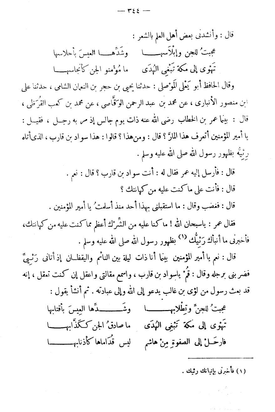 ثُمَّ أَنْشَأَ يَقُولُ: عَجِبْتُ لِلْجِنِّ وَتَطْلَابِهَا * وَشَدِّهَا الْعِيسَ بِأَقْتَابِهَا تَهْوِي إِلَى مَكَّةَ تَبْغِي الْهدى * مَا صَادِق الْجِنّ ككذابها فارحل لى الصفوة من هَاشم * لَيْسَ قداماها كأذنابها